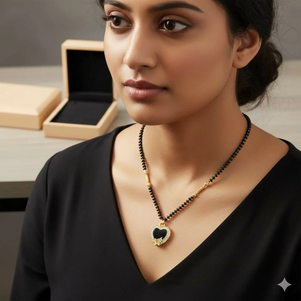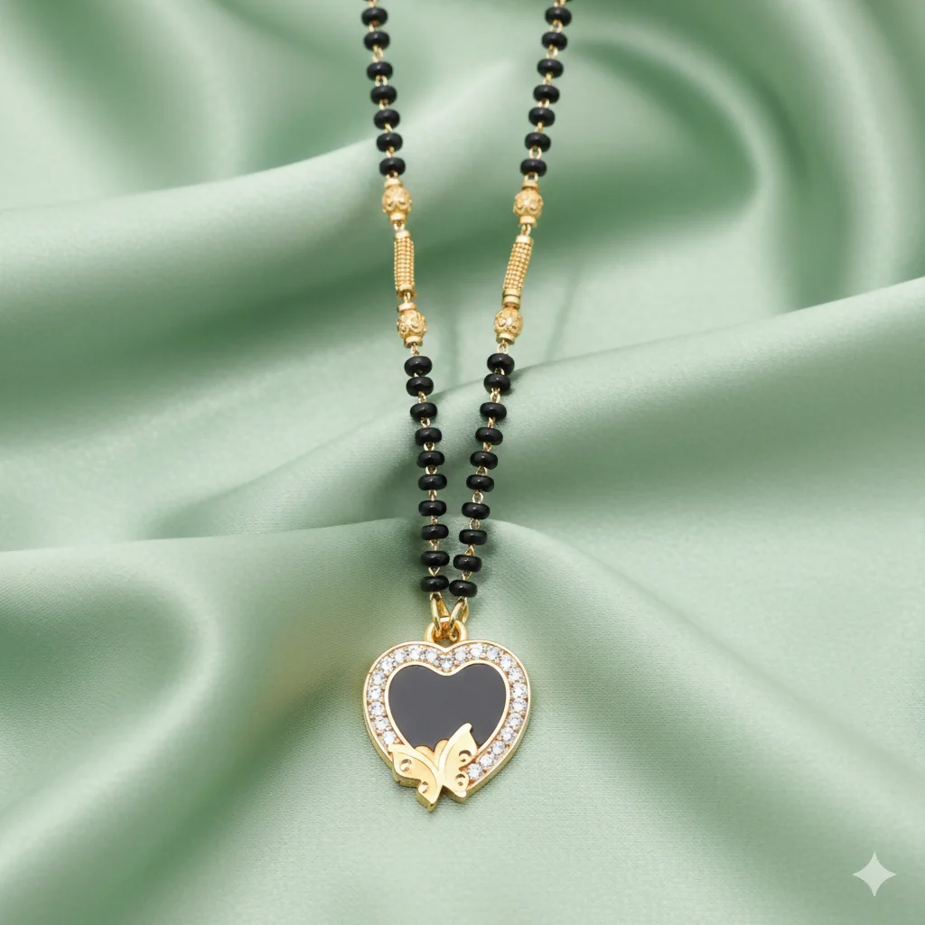 This striking Mangalsutra features a sophisticated heart-shaped pendant finished with sleek black enamel and adorned with a delicate golden butterfly motif. Framed by a halo of shimmering American Diamonds (CZ), this piece is a bold statement of love and contemporary grace.