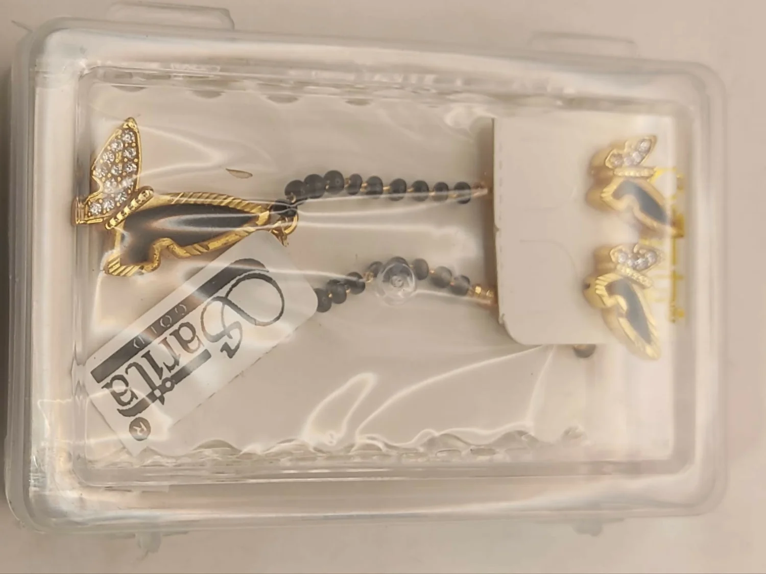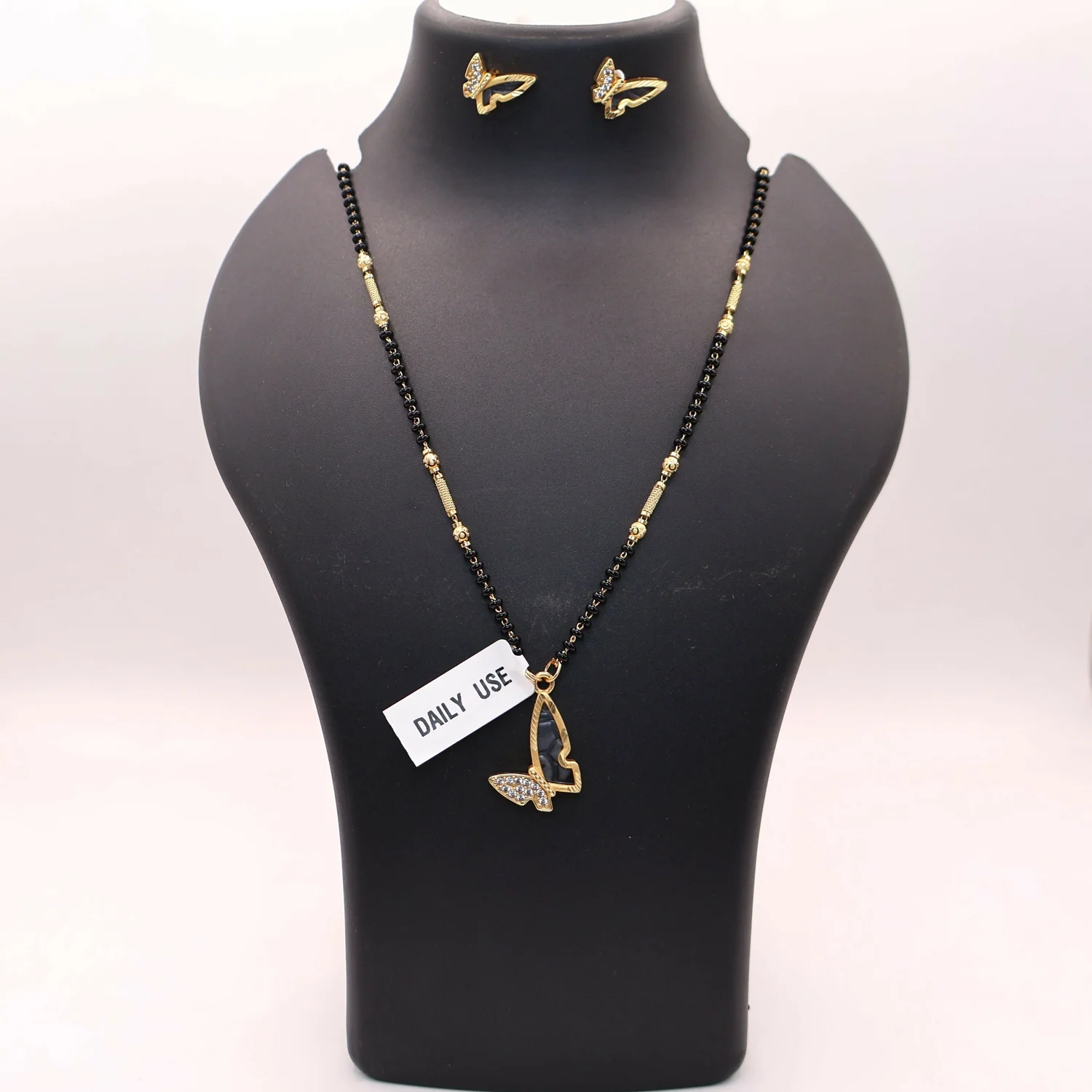 Set Includes: 1 Mangalsutra necklace and 1 pair of matching butterfly stud earrings.