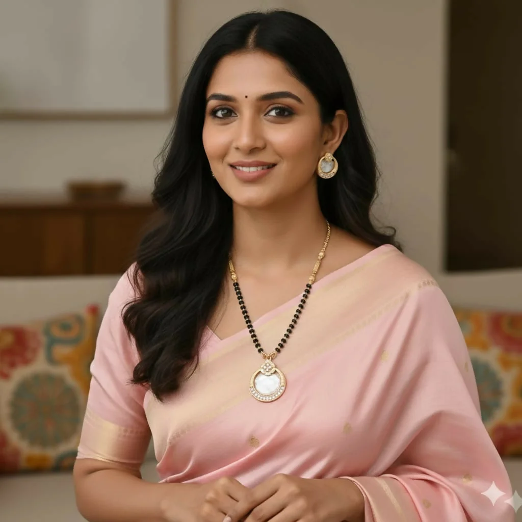 The Chain: A classic black-bead string (Mangalsutra) interspersed with intricately textured gold-toned spacers, offering a refined and lightweight feel.