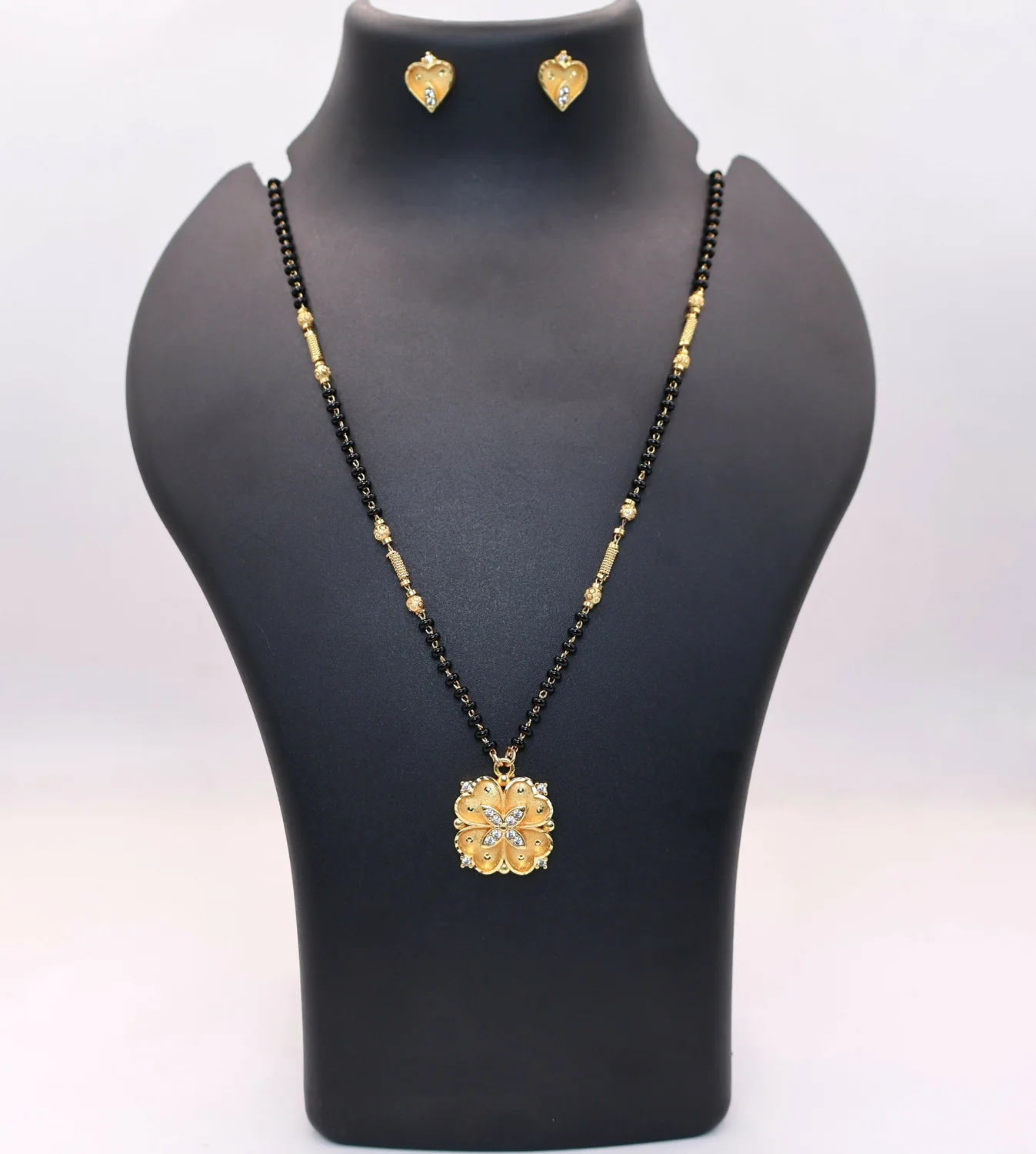 The set includes a stunning matching Mangalsutra, featuring the iconic black beads (kali mani) interspersed with intricate gold-toned cylinders. The centerpiece is a magnificent four-leaf clover floral pendant, symbolic of luck and prosperity. The pendant is finished with a luxurious brushed gold texture and centered with a brilliant diamond-style starburst.