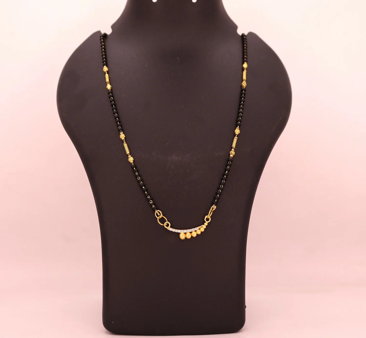 Elevate your everyday elegance with this beautifully crafted Traditional Gold-Plated Mangalsutra. Designed for the modern woman who cherishes her heritage, this piece features a delicate, curved pendant adorned with shimmering Cubic Zirconia (CZ) stones and graduated gold-tone droplets.