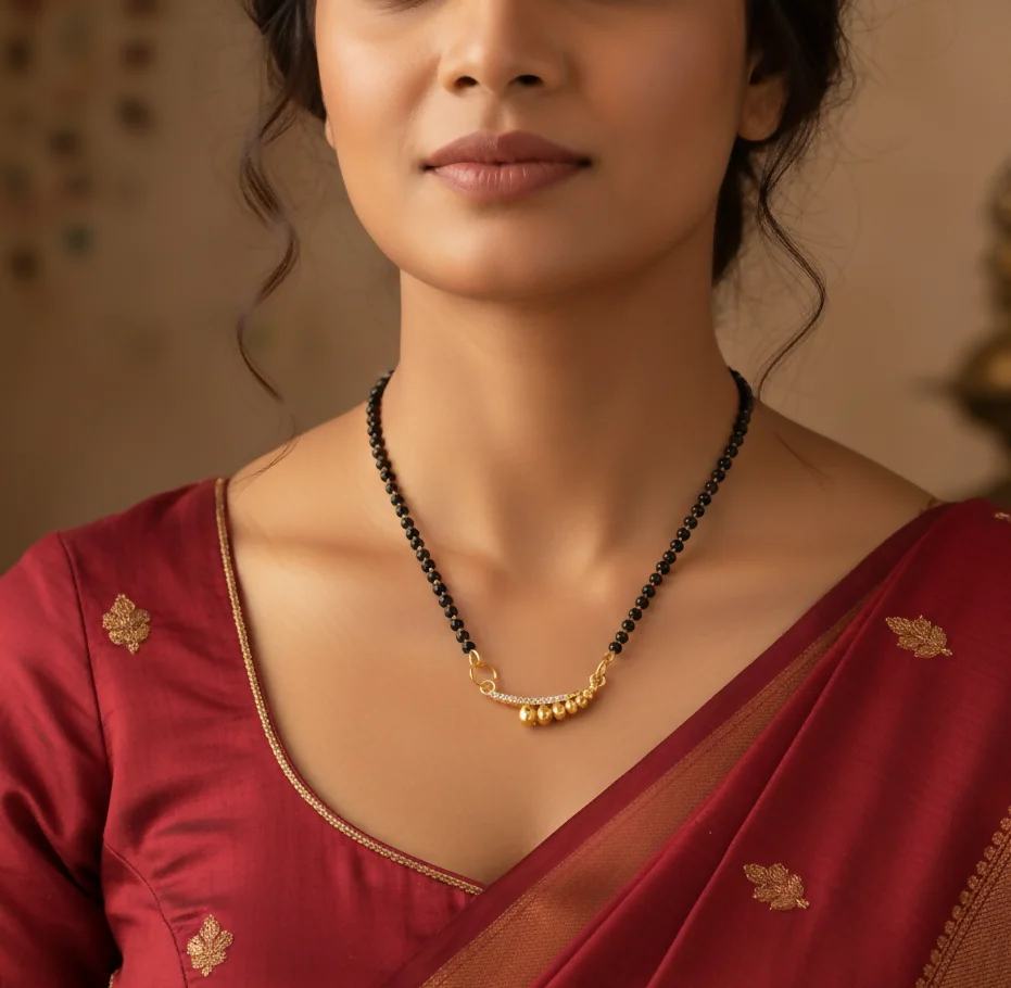 The pendant is suspended from a classic black-beaded (Karimani) chain, symbolizing protection and marital bliss. Its lightweight and sleek design makes it perfect for both daily wear and special occasions, seamlessly complementing ethnic sarees or contemporary office attire.