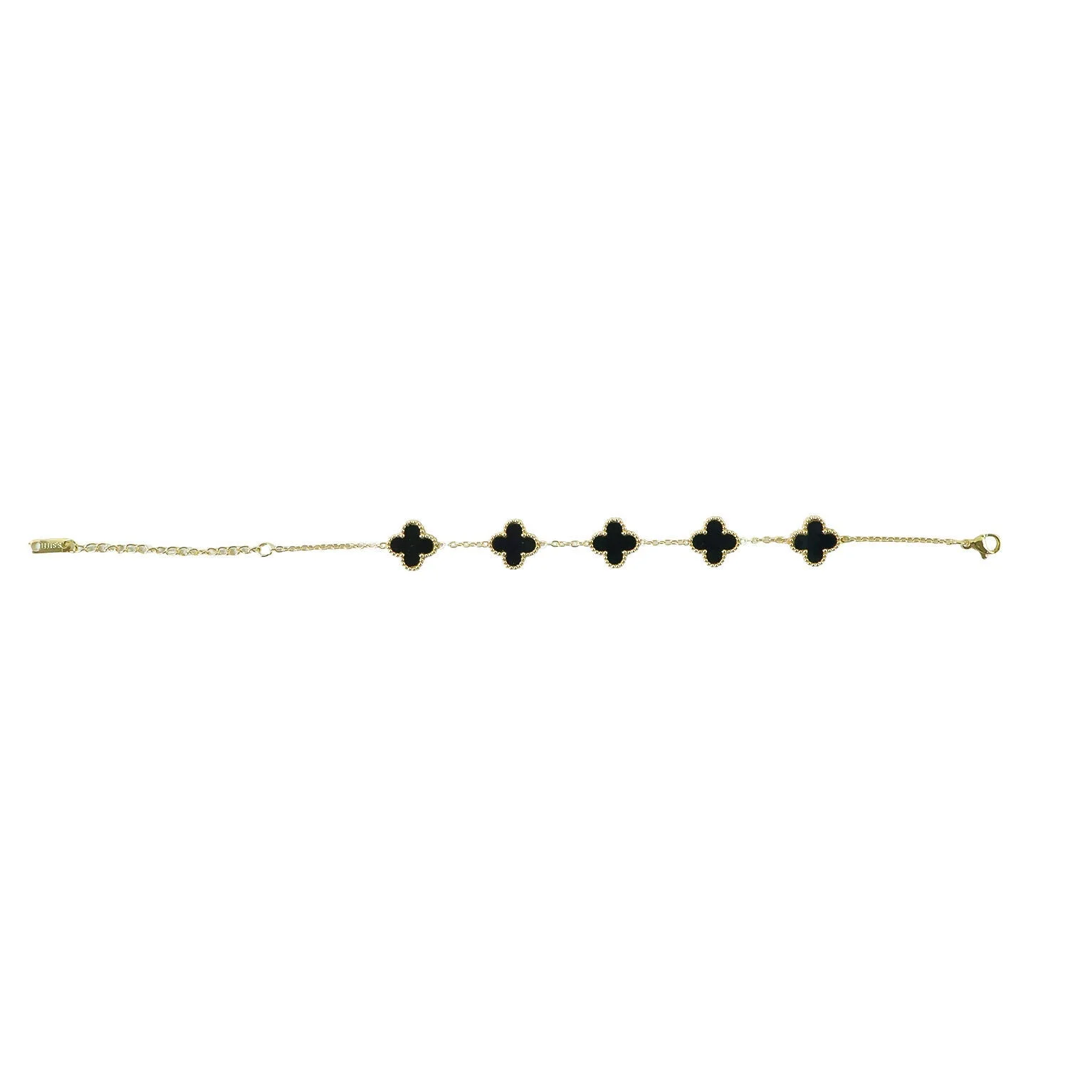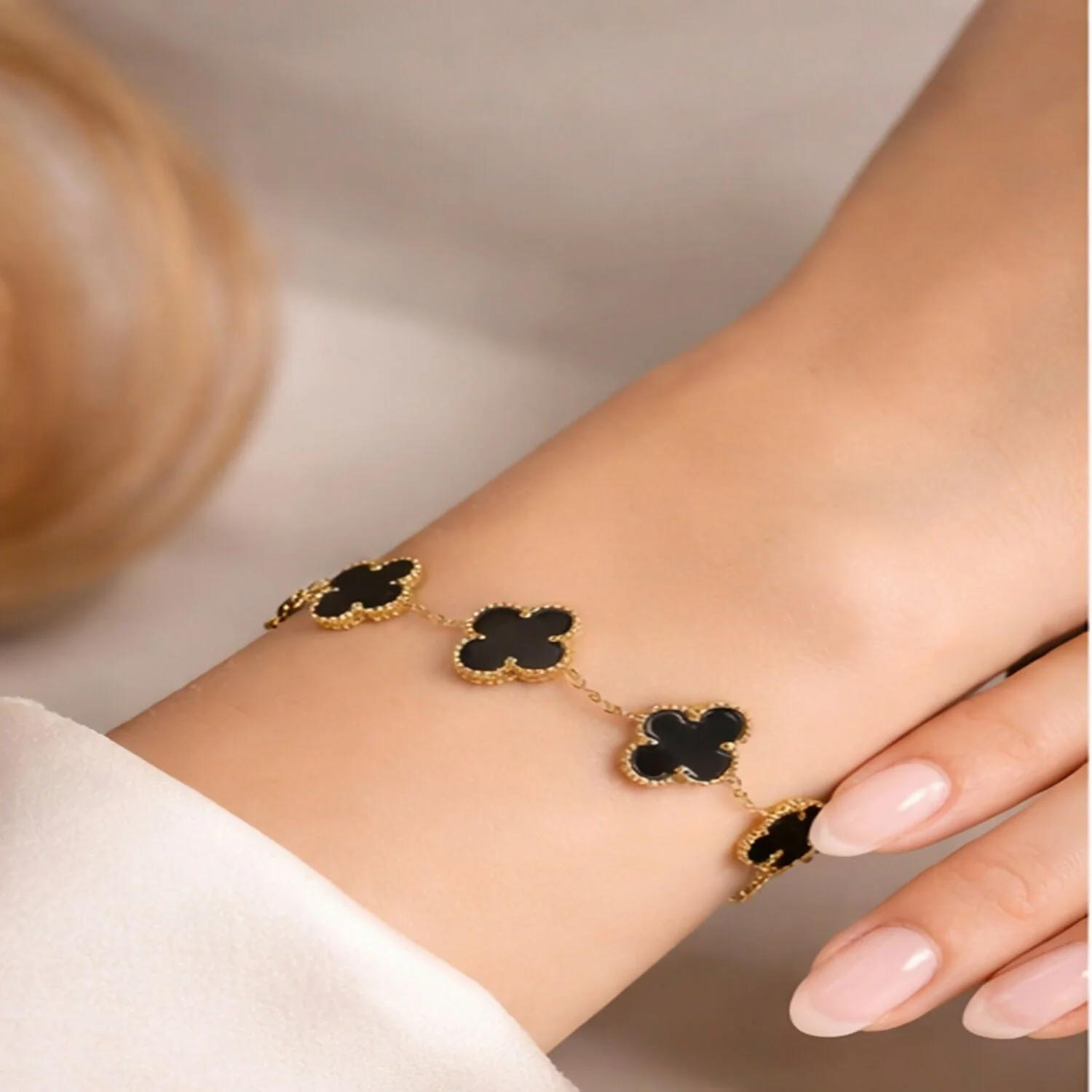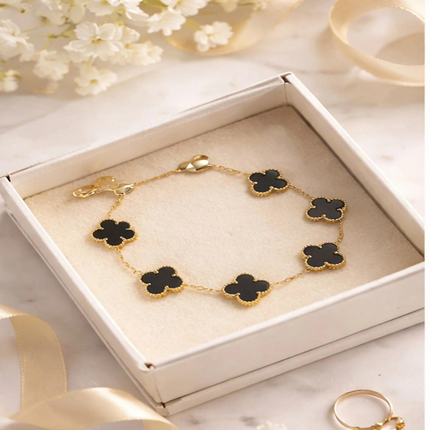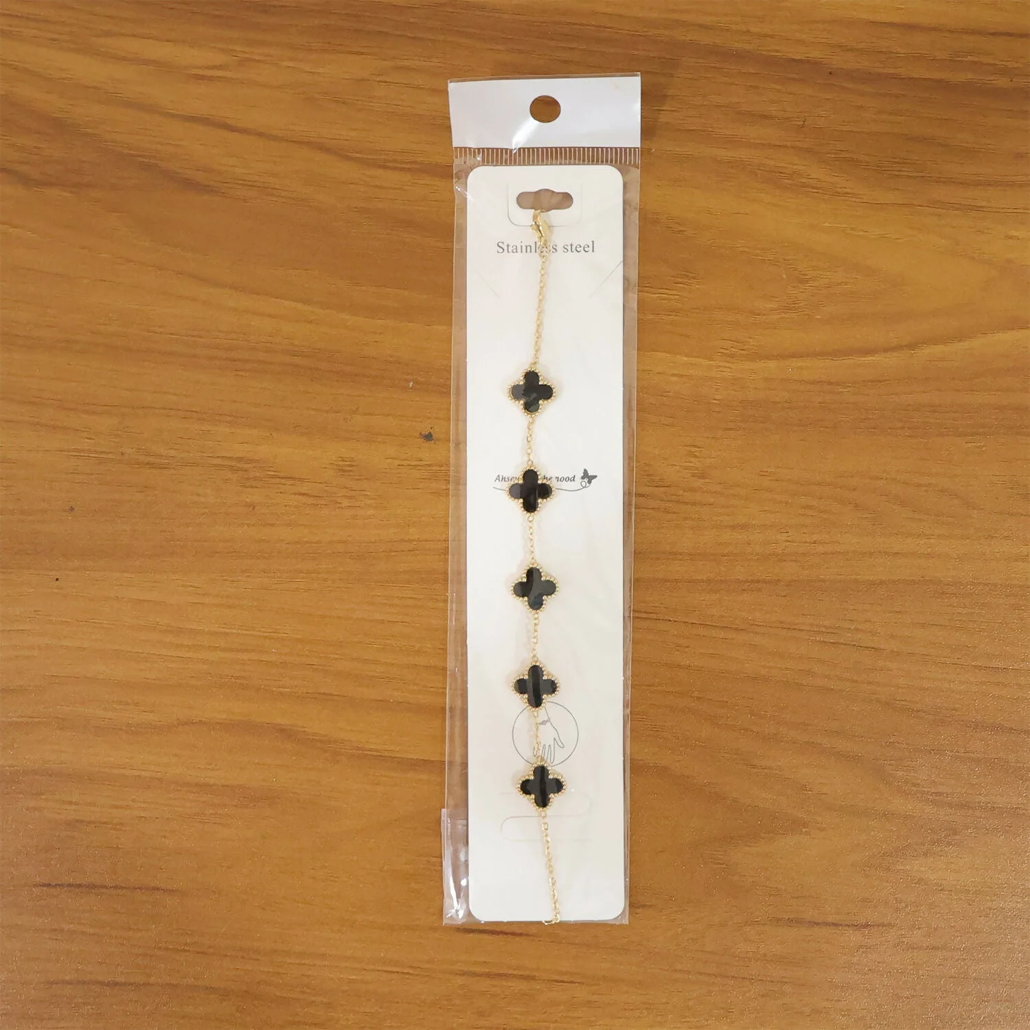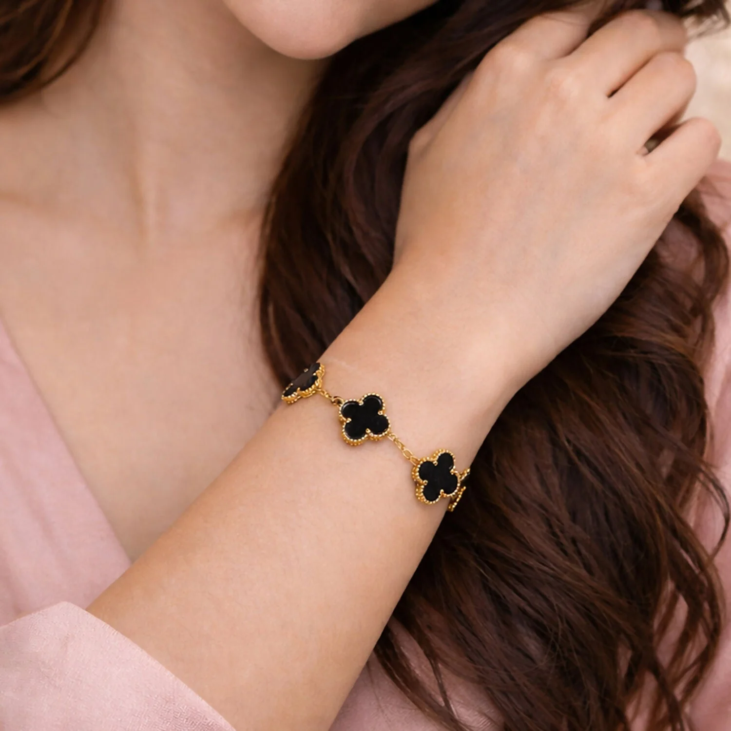 The bracelet features a lightweight and comfortable chain design with an adjustable clasp that ensures a perfect fit for every wrist size. The glossy black clover charms enhance its fashionable appearance, making it a perfect accessory to match both traditional and western outfits.