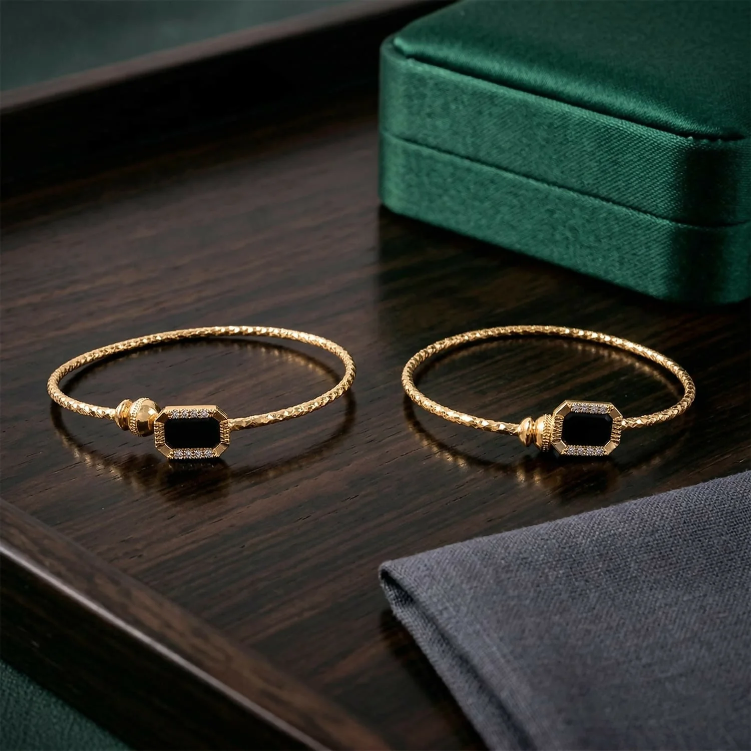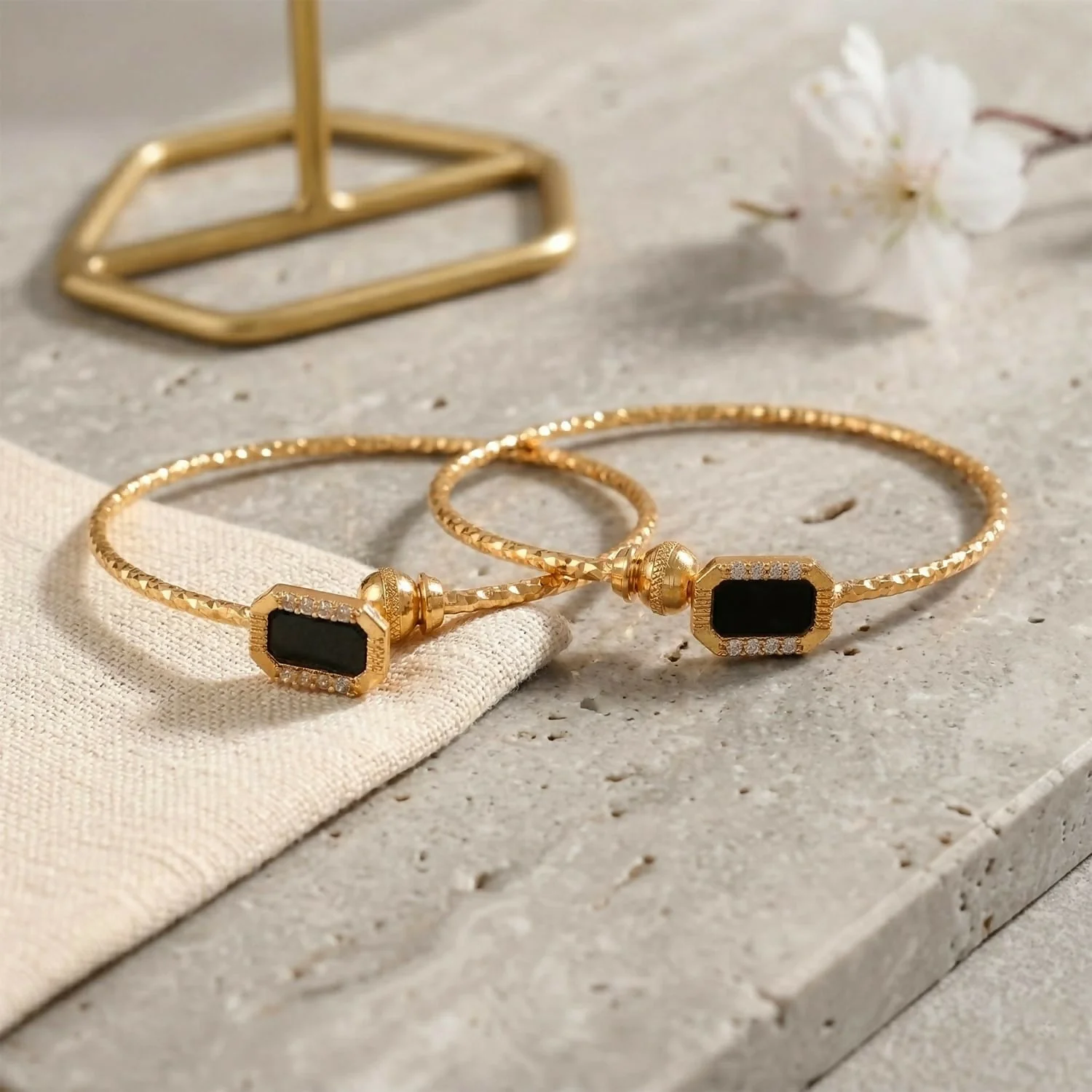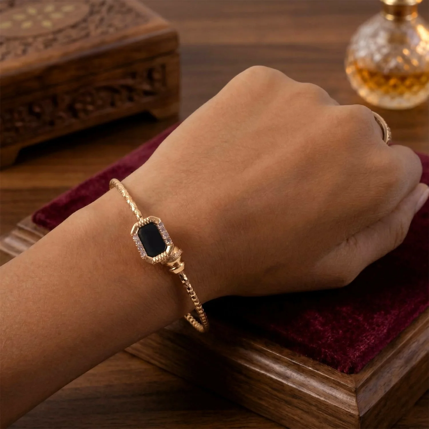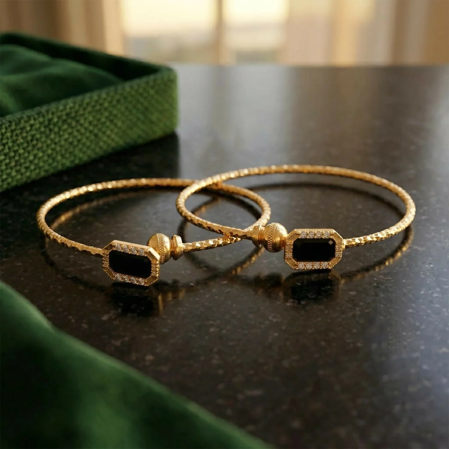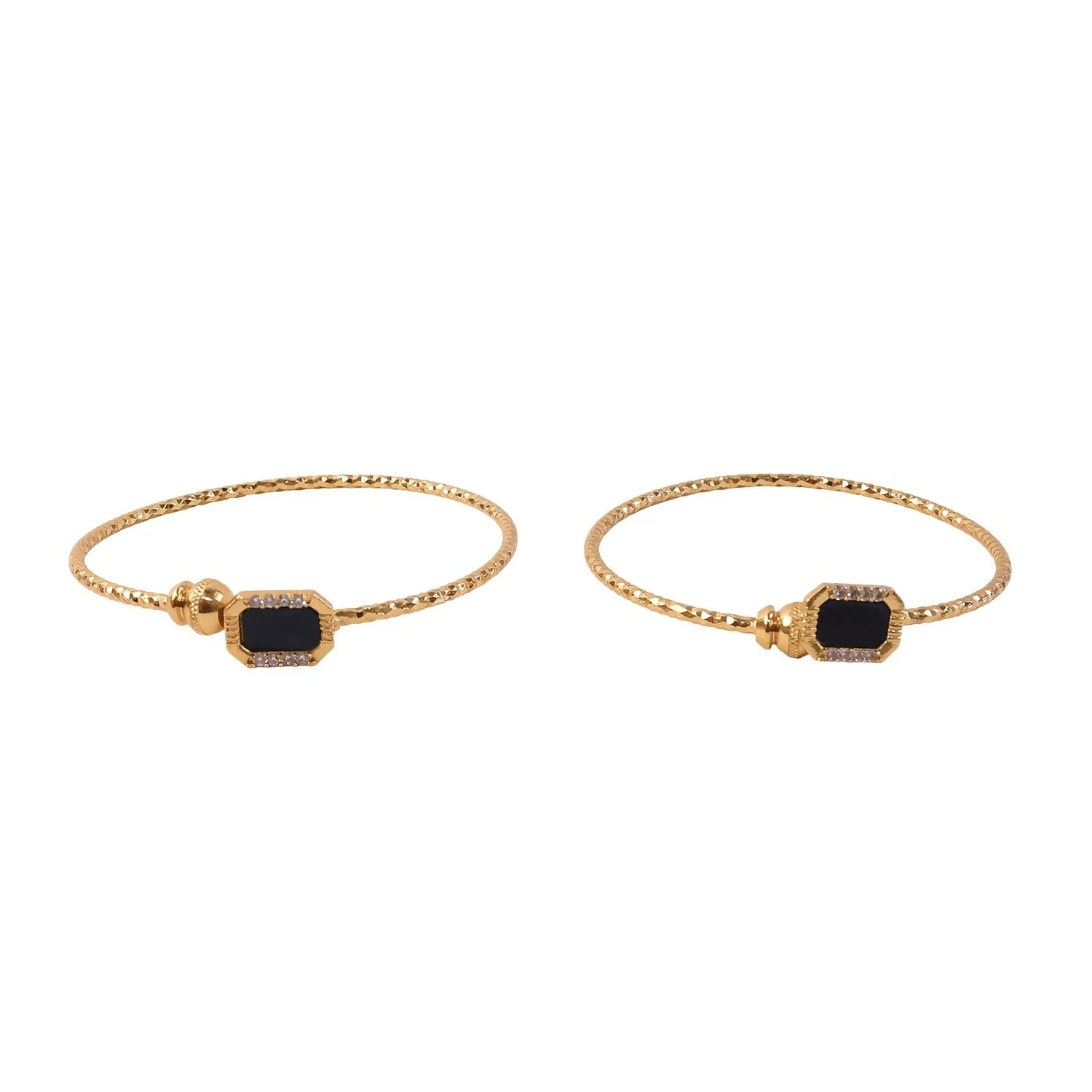 Enhance your elegance with this Gold Plated Black Stone Designer Open Bangle Bracelet. Crafted with a beautifully textured gold finish, this bracelet features stunning black stone accents framed with delicate crystal detailing, creating a sophisticated and modern look.