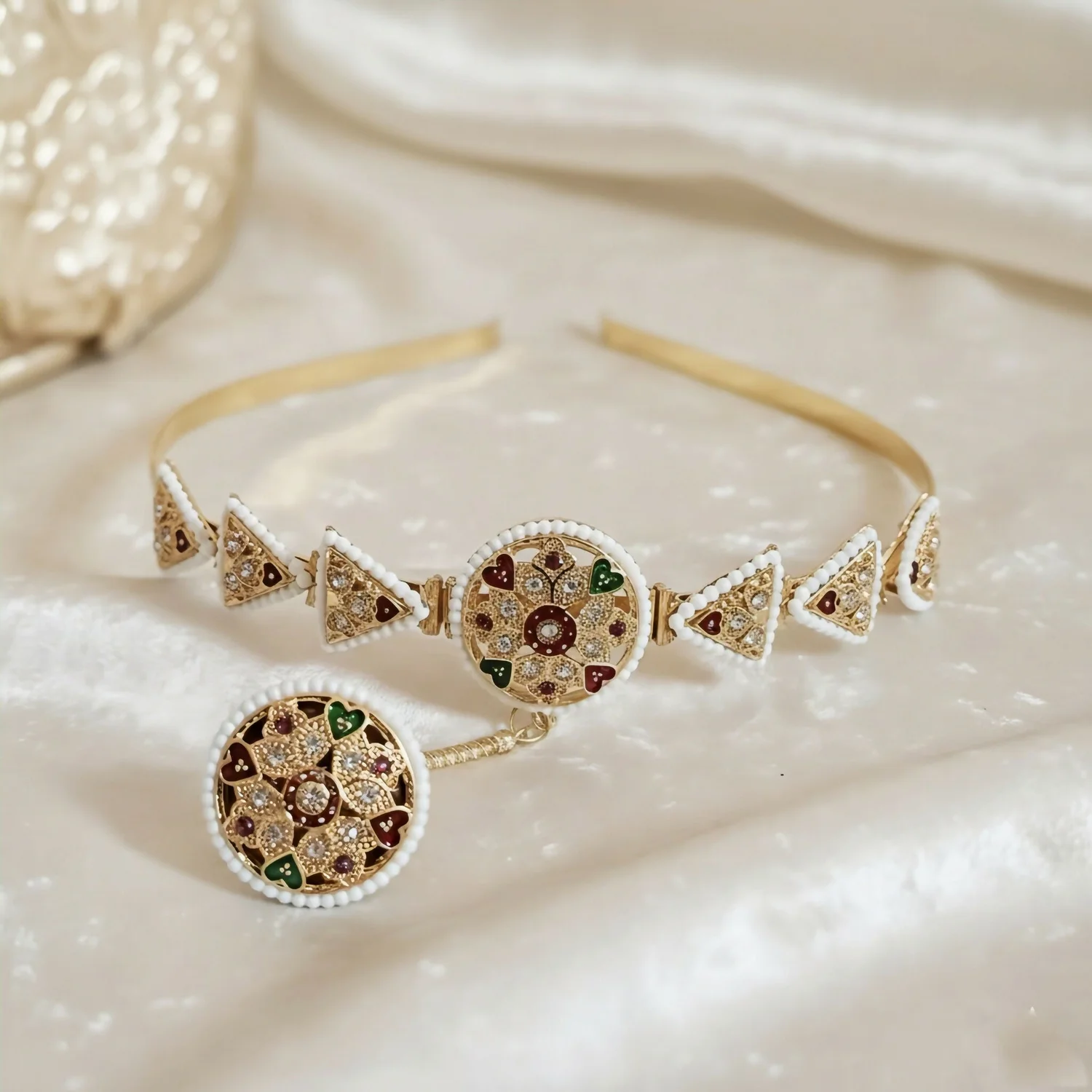 Geometric Accents: The band is flanked by gold-toned triangular links, each delicately bordered with tiny white pearls (moti) for a soft, feminine finish.