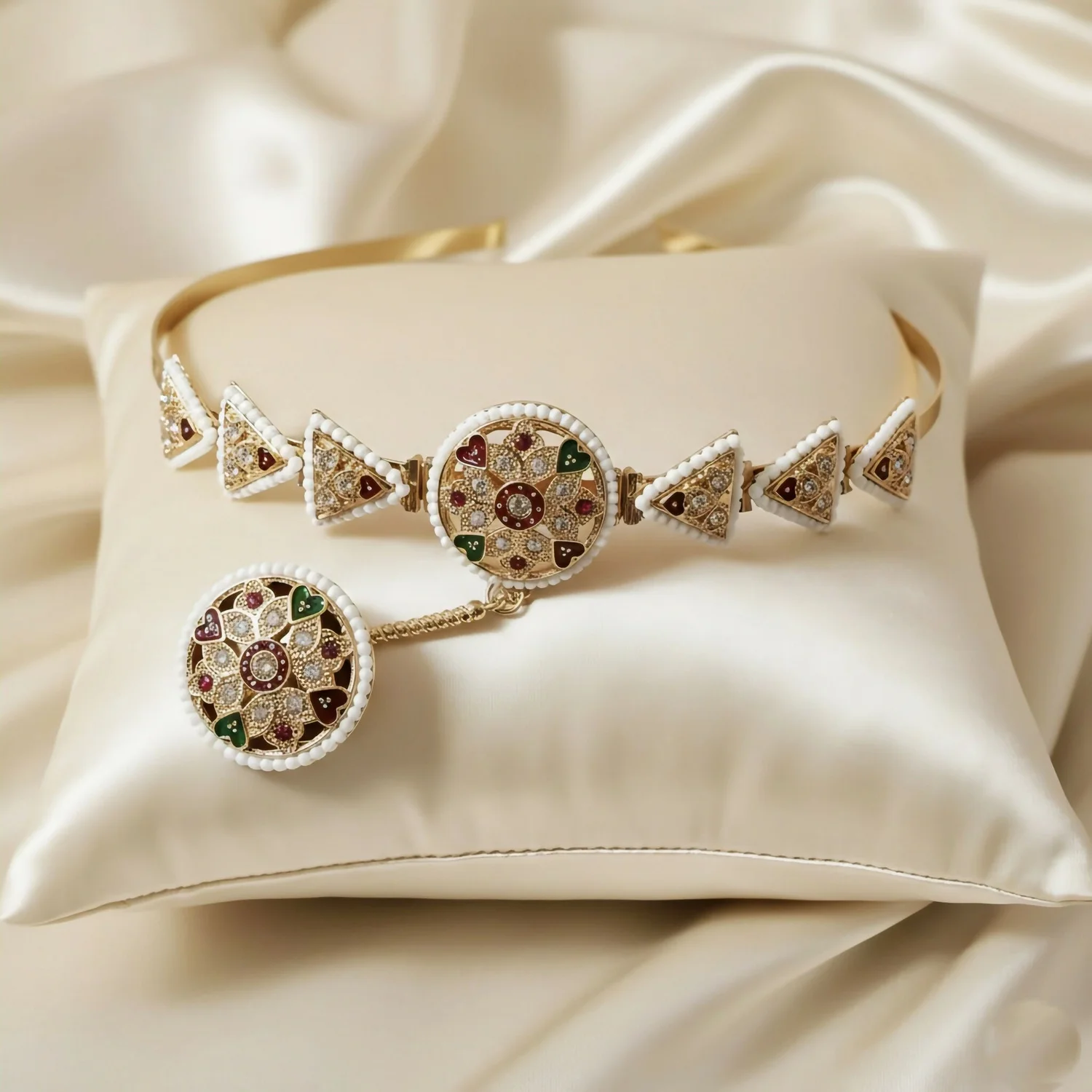 | Inlay | Meenakari enamel, synthetic stones, and faux pearls |