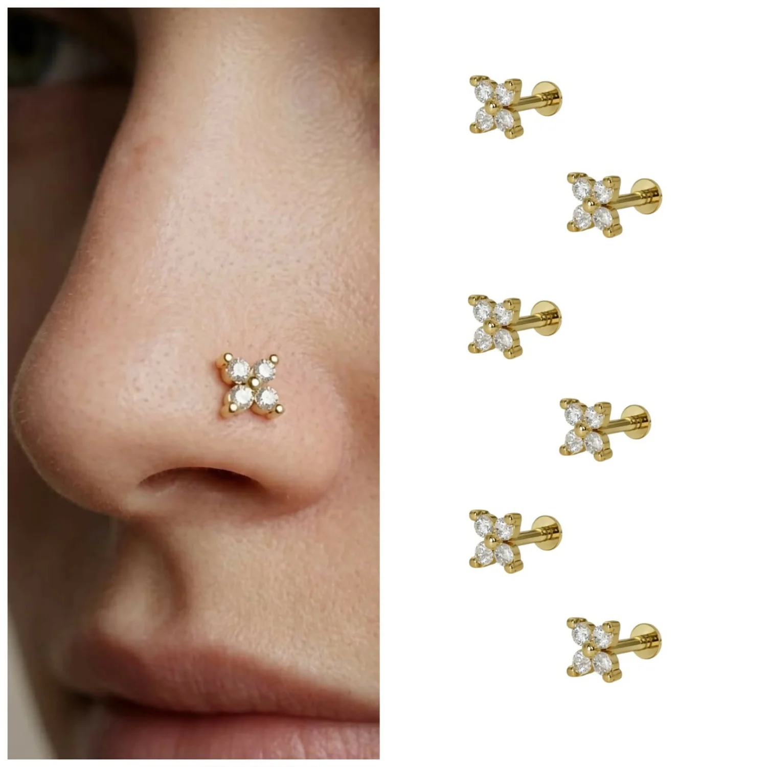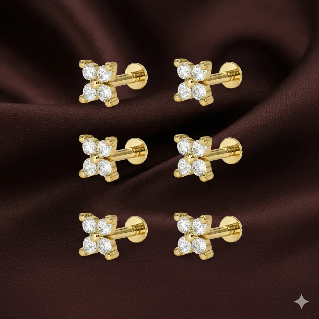Elevate your jewelry collection with this stunning Four-Petal Clover Labret Stud. Crafted for both elegance and comfort, this piece features four brilliant-cut sparkling crystals set in a classic yellow gold-plated finish. The unique "X" or floral silhouette offers a modern twist on a timeless design, making it a versatile addition to any look.