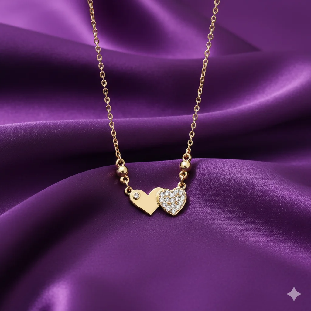 Celebrate connection and unity with this charming Gold Plated Double Heart Necklace. This delicate piece features two complementary hearts suspended side-by-side: one heart boasts a highly polished, smooth gold-plated finish for a classic shine, while the other is beautifully paved with sparkling Cubic Zirconia (CZ) stones for brilliant radiance.