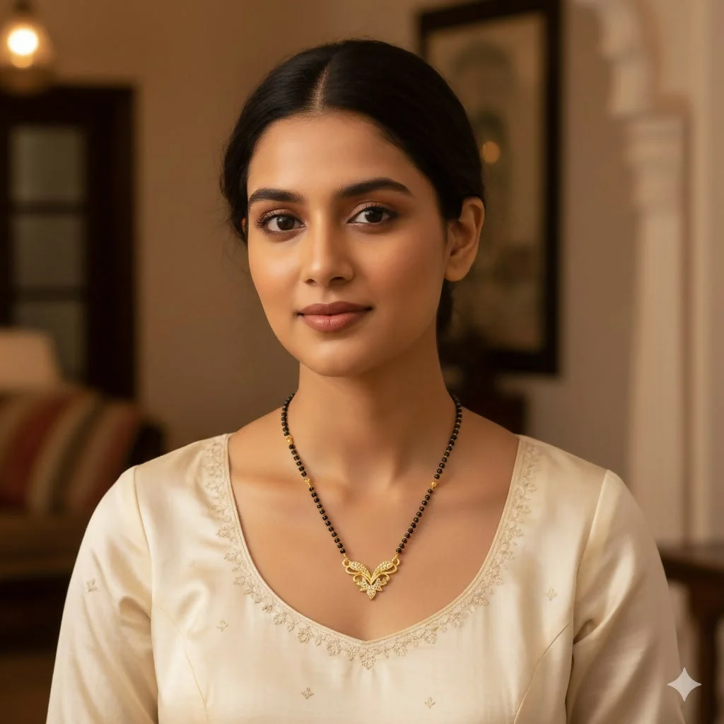 Traditional Beadwork: Classic double-layered black beads (Mani) symbolize protection and marital harmony.