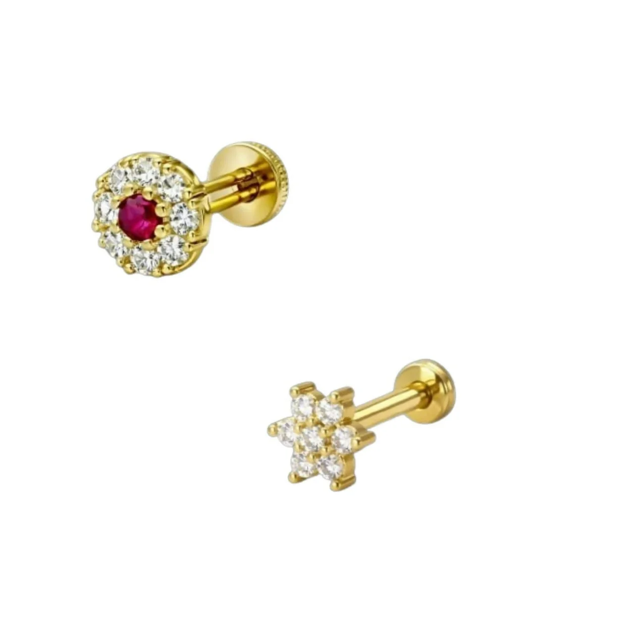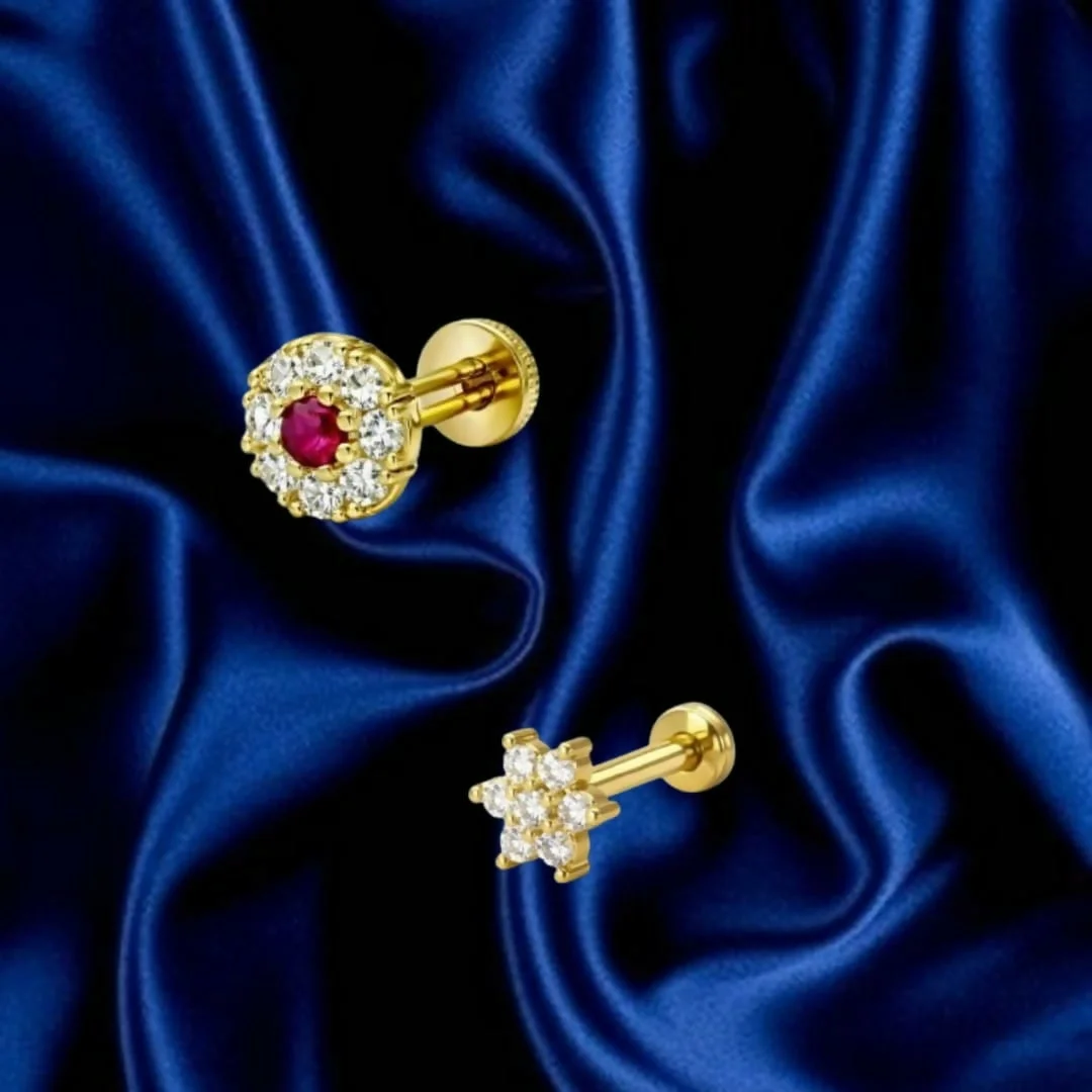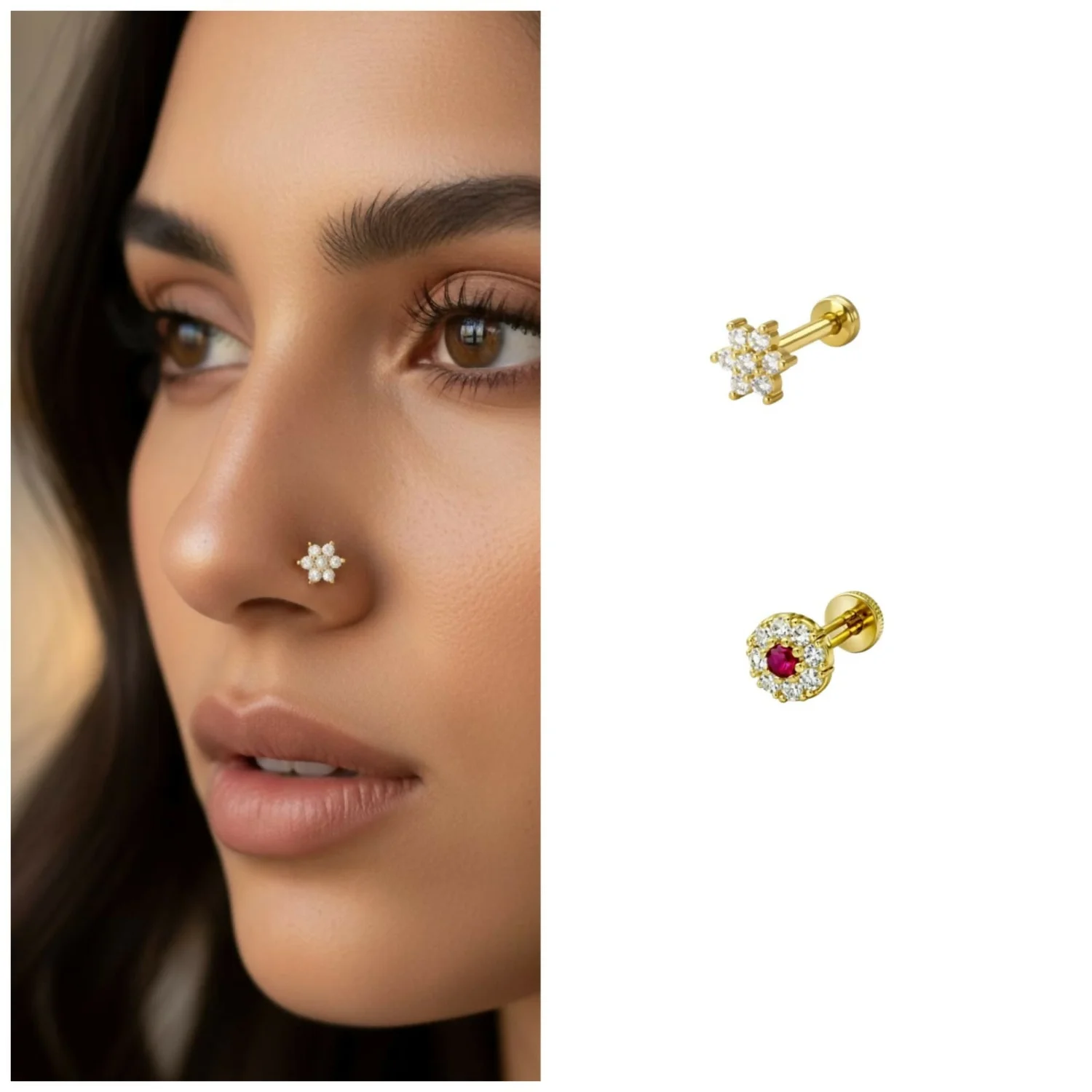 Elevate your everyday look with our exquisite Floral Nose Stud Set. Crafted for both comfort and style, this set features two stunning designs: a classic shimmering diamond-white crystal flower and a sophisticated ruby-red center floral halo. Both pieces are finished in premium gold plating, offering a luxurious tarnish-resistant glow that complements any skin tone.