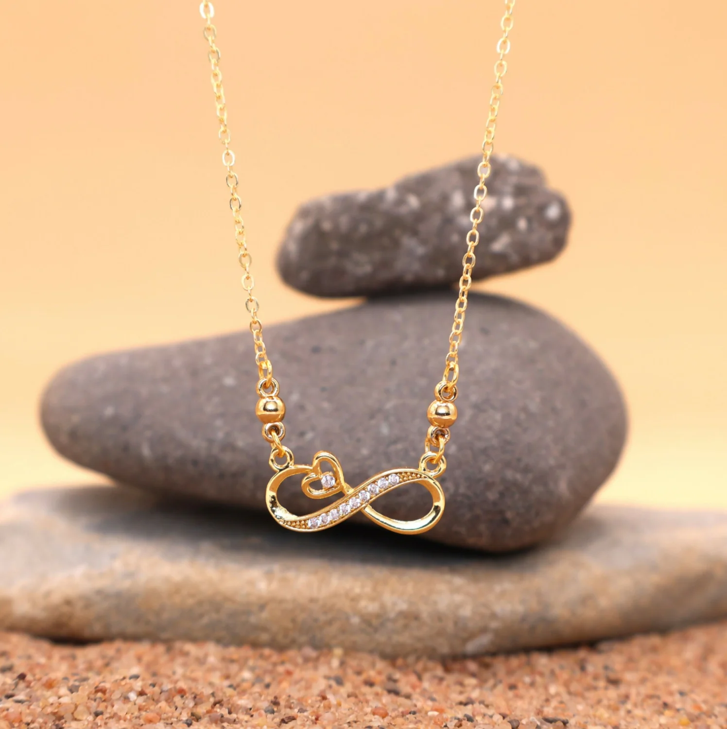 Celebrate endless love and connection with this exquisite Gold Plated Infinity Heart Necklace. The elegant pendant features the timeless infinity symbol, signifying eternal commitment and limitless possibility. Nestled within the loop is a charming small heart, beautifully symbolizing enduring affection.
