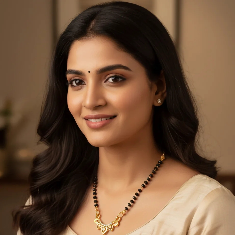 Traditional Beads: Stringed with classic black "kali pot" beads, symbolizing protection and marital bliss.