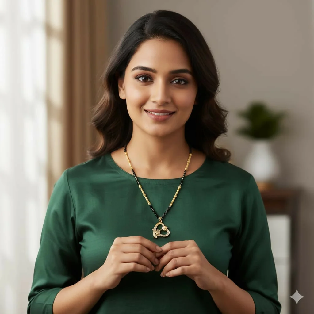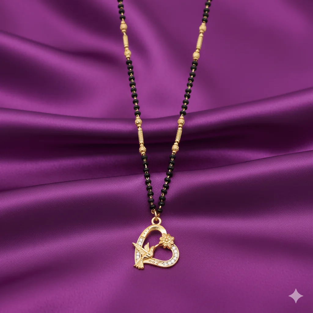 This contemporary Mangalsutra features a uniquely crafted heart-shaped pendant featuring a delicate hummingbird and floral motif. Detailed with shimmering Cubic Zirconia (CZ) stones, this design symbolizes joy, love, and the beauty of new beginnings.