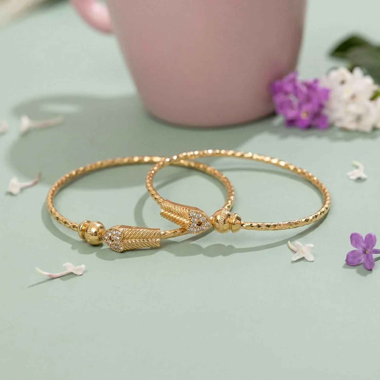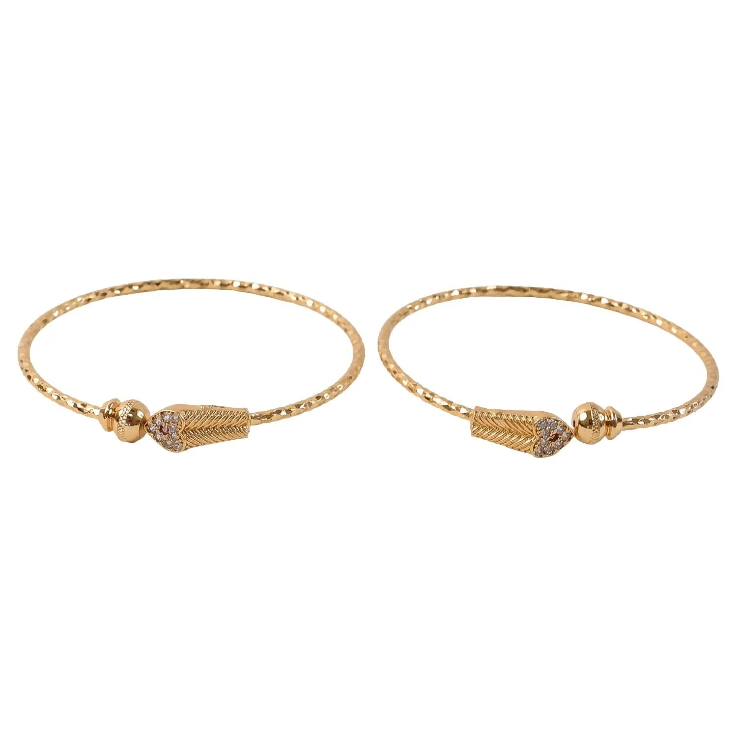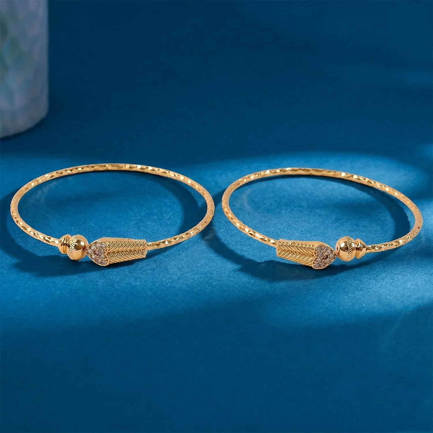 Add a touch of elegance to your jewelry collection with this beautifully crafted gold plated leaf design kada bracelet pair. Featuring a finely textured band with a delicate leaf motif and sparkling stone accents, these bangles offer a perfect blend of sophistication and modern charm. The stylish openable design ensures easy wear while providing a secure and comfortable fit.