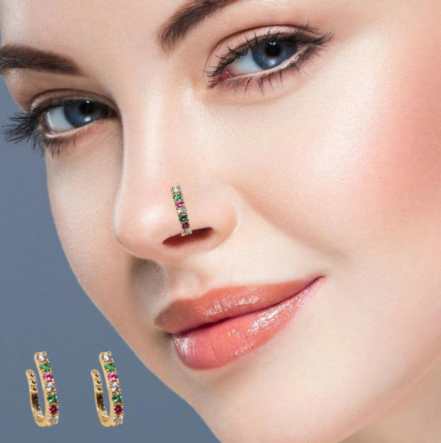 Elevate your look with this stunning Gold PlPlated Multi-Color Stone Nose Ring/Nose Hoop. This non-piercing clip-on nose cuff features a chic, double-band design adorned with vibrant, embedded stones in shades of green, red (or pink), and clear/white. The secure clip-on design makes it perfect for those who want the style of a nose piercing without the commitment. Lightweight and comfortable for all-day wear, it's an ideal accessory for parties, weddings, festivals, or daily fashion.