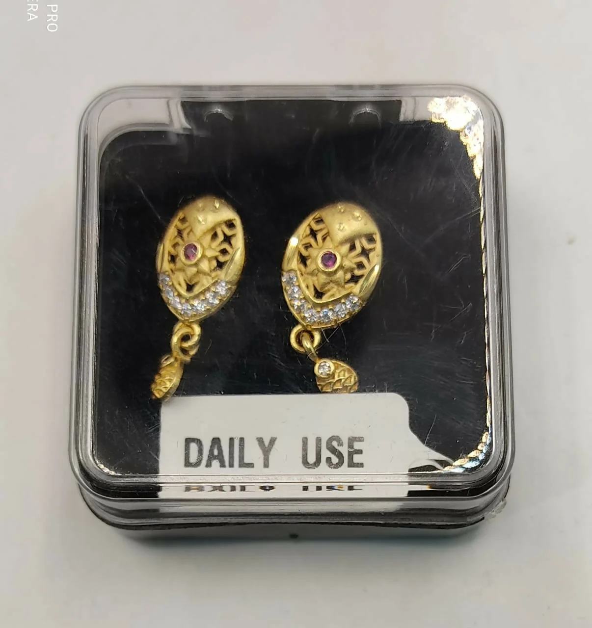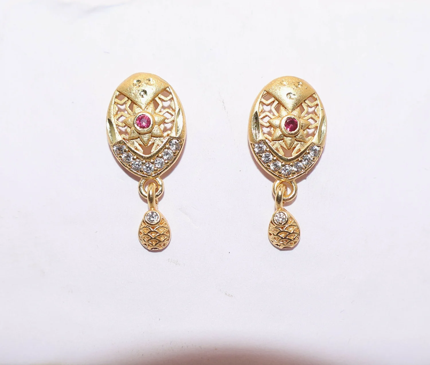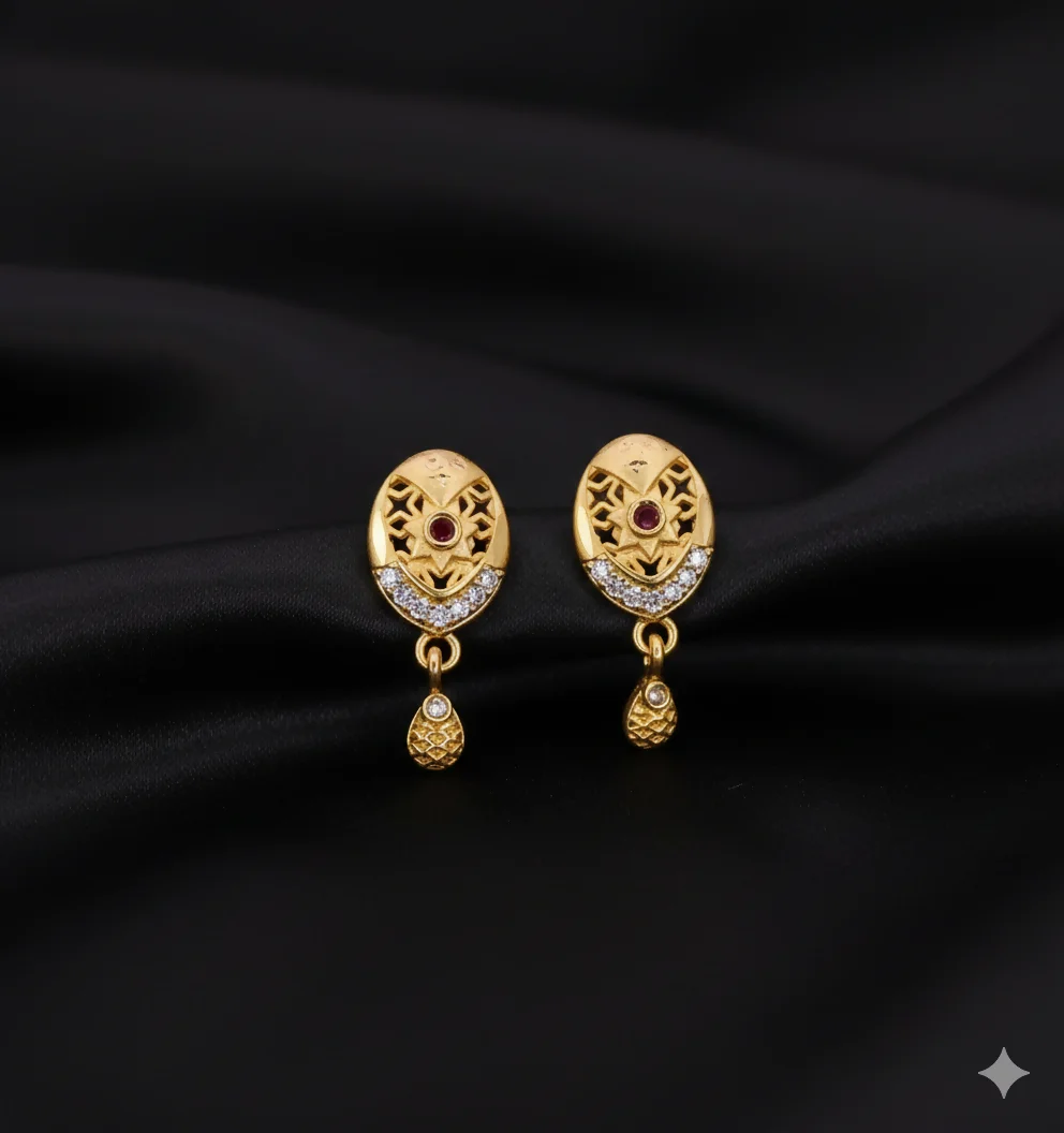 Design: Features a detailed, ornate oval stud with a charming lower drop.