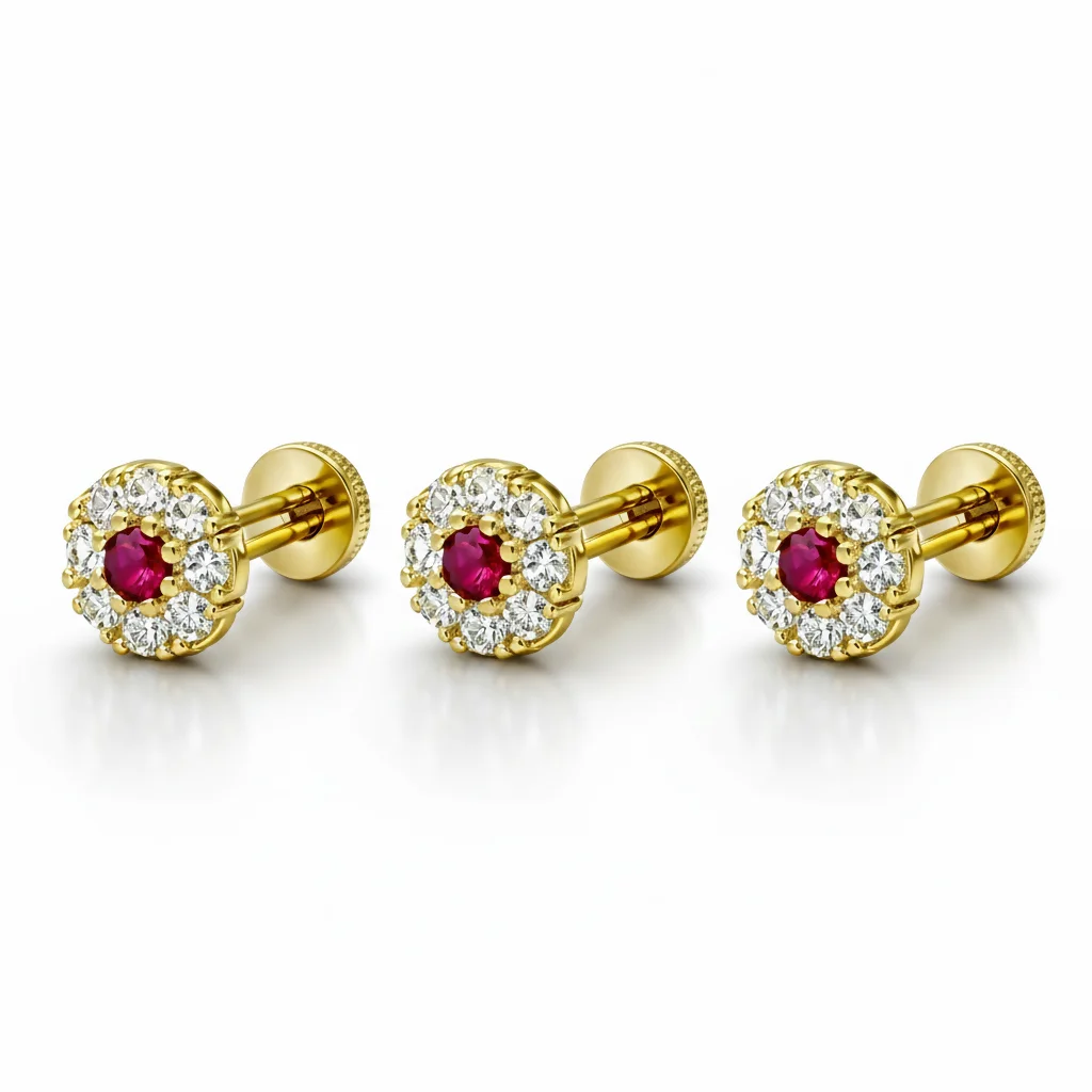 Be the first to review Gold plated Ruby & Diamond Floral Halo Nose Pin Labret Stud Combo Pack of 3!