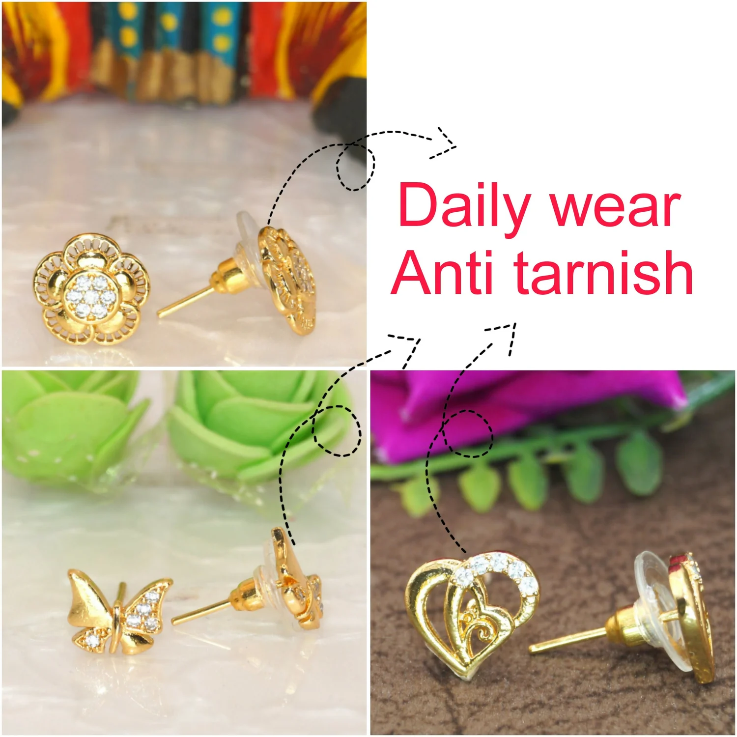 Dazzling Butterfly Studs: Delicate butterfly shapes finished in a high-shine gold tone, featuring subtle CZ embellishments along the wings for a touch of light and charm. These add a whimsical flair to your ensemble.