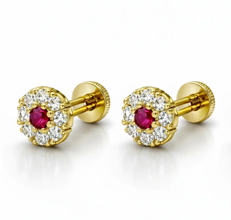Elevate your everyday look with this stunning Floral Halo Nose Pin. Expertly crafted with a vibrant, lab-grown red ruby at its heart, this piece is encircled by a shimmering halo of brilliant white stones that mimic the delicate petals of a flower.