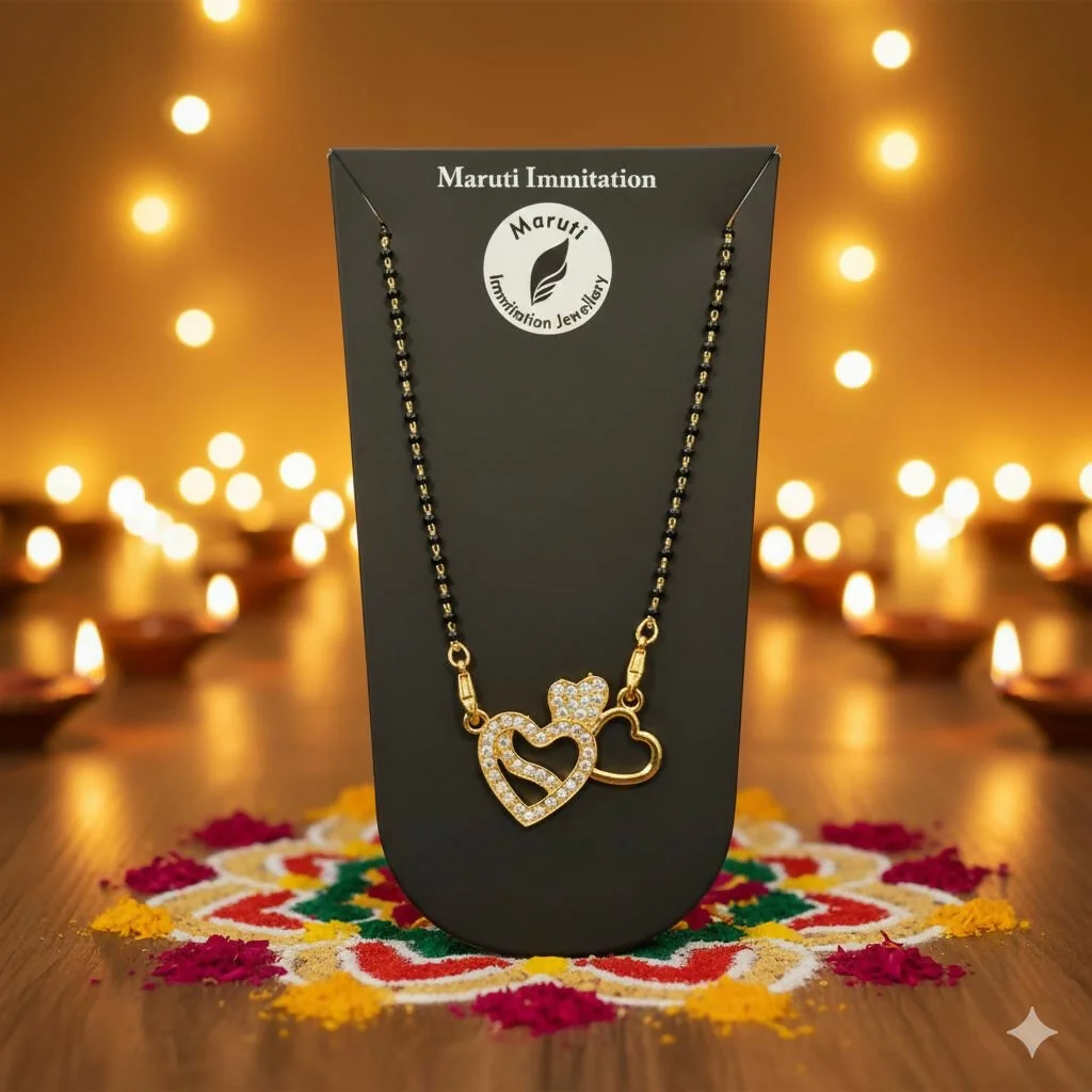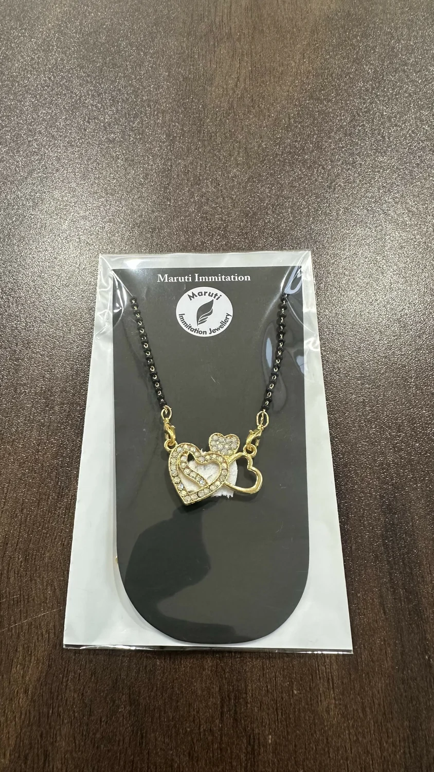This stylish mangalsutra features a charming double-heart pendant adorned with shimmering stones, giving it a graceful and modern appeal. The black-bead chain complements the gold-tone finish, creating a perfect balance of tradition and contemporary elegance. Its lightweight and finely crafted design makes it ideal for daily wear while still standing out beautifully for festive and special occasions. The heart-shaped motif symbolizes love and togetherness, making it a thoughtful gift or a delightful addition to your jewelry collection. A lovely accessory for enhancing both casual and ethnic outfits with a touch of sparkle and sophistication.