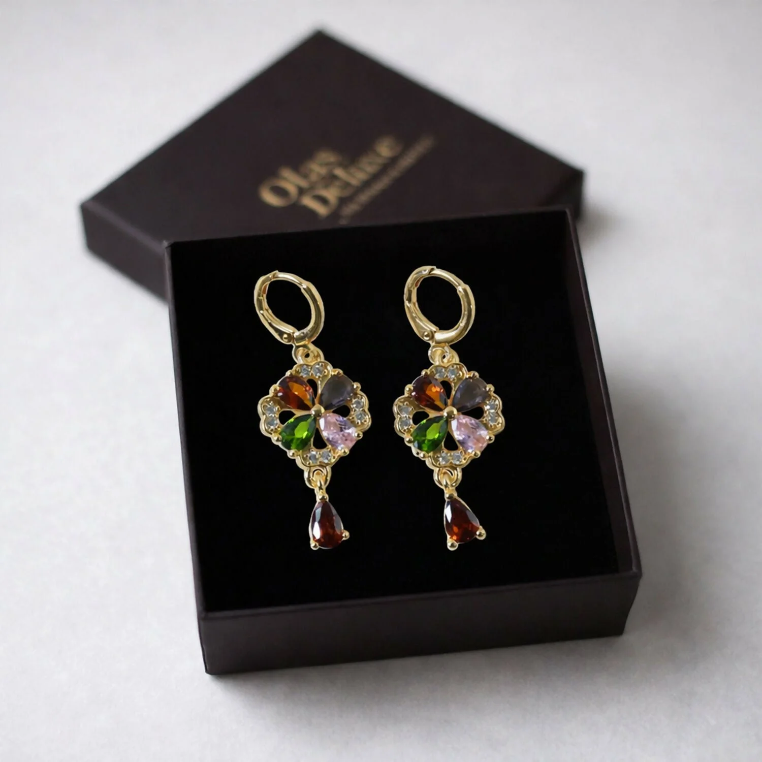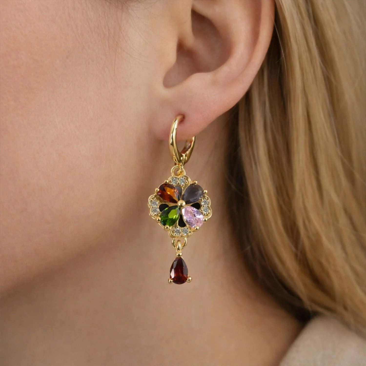 Make a bold and vibrant style statement with these gold-tone multicolor crystal floral drop earrings. Designed with a beautifully detailed flower motif, these earrings feature colorful stone accents arranged in a petal pattern and surrounded by sparkling crystals. The elegant drop design is enhanced with a teardrop-shaped hanging stone that adds graceful movement and extra charm. The polished hoop closure ensures a secure and comfortable fit for extended wear. Perfect for festive occasions, weddings, parties, and special celebrations, these earrings effortlessly complement both traditional and contemporary outfits while adding a touch of luxurious color.