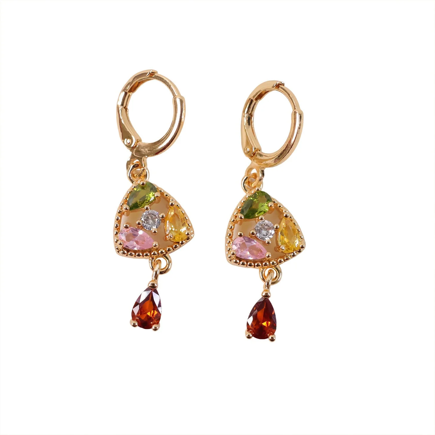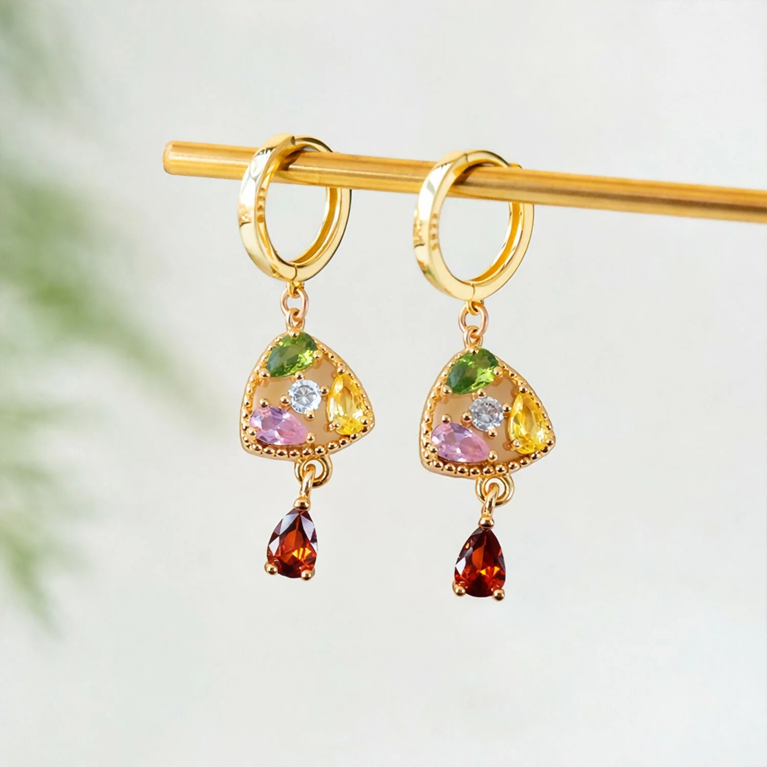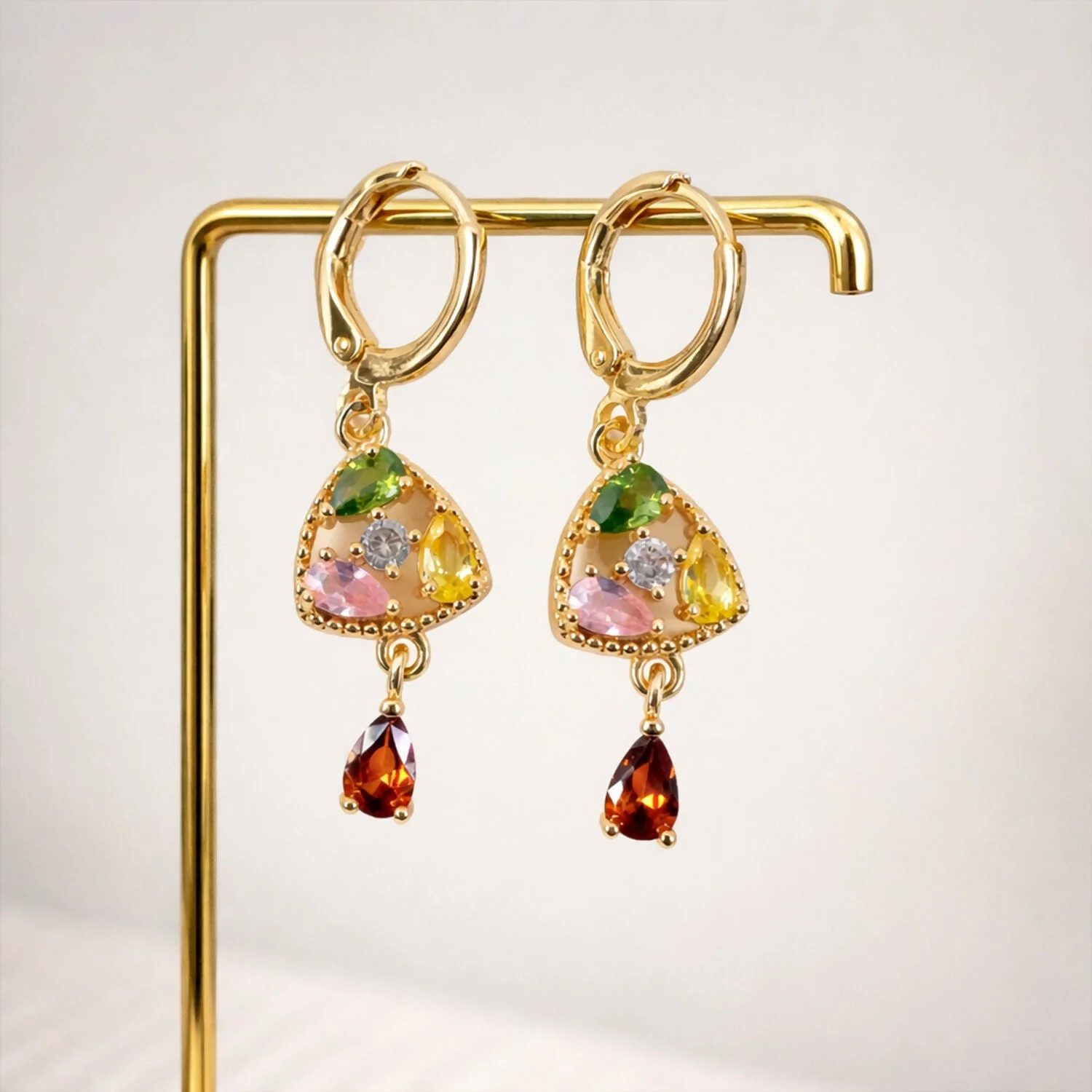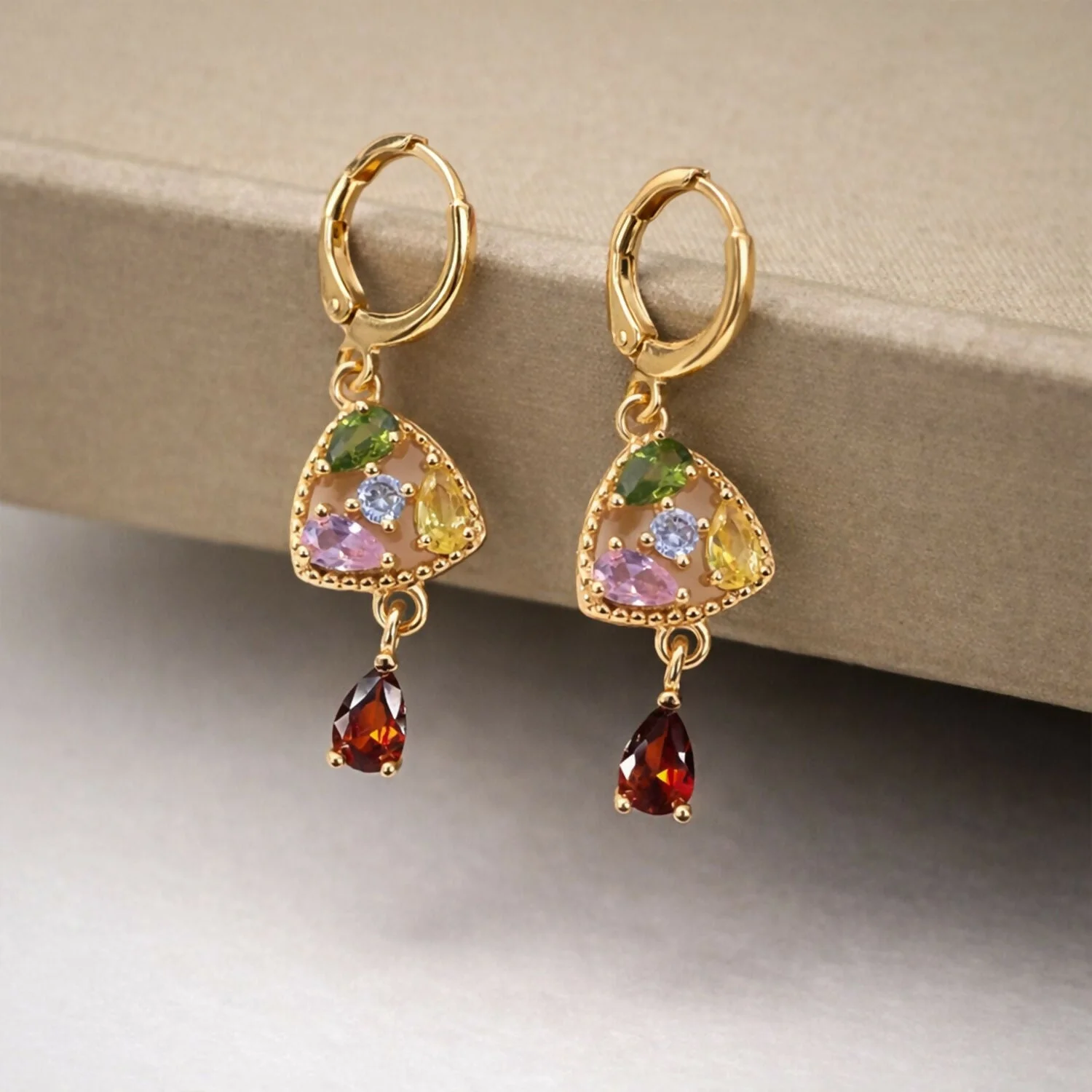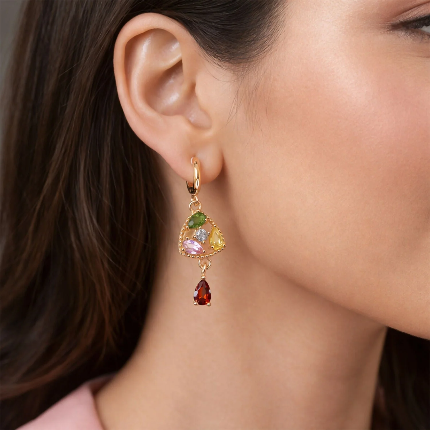 Upgrade your jewellery collection with these stylish gold-tone drop earrings designed with a unique multicolor stone pattern. The earrings feature a trendy hoop-lock style with a triangular charm decorated with sparkling stones, along with an elegant hanging drop stone that adds extra shine. Perfect for parties, festive wear, weddings, and special occasions, these earrings give a premium and modern look. Lightweight and comfortable, they are ideal for women and girls who love classy and fashionable accessories. A great gifting option for birthdays, anniversaries, and celebrations.