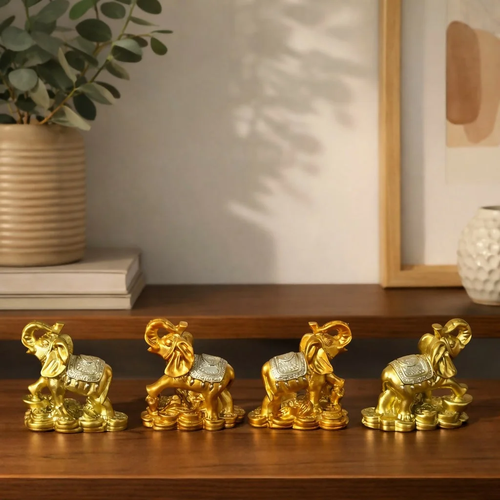 Perfect for placement on shelves, consoles, desks, temples, or entry tables, this decorative elephant set enhances interiors with a premium metallic finish. It also makes a thoughtful gift for housewarming, festive occasions, anniversaries, and celebrations.