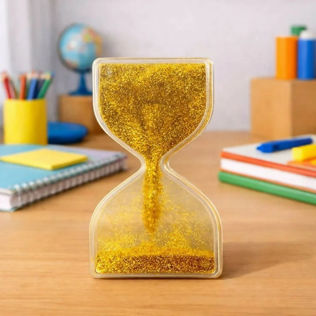 liquid timer, glitter hourglass, golden desk toy, sensory toy, stress relief toy, desk decor, study table accessory, office desk decoration, focus tool, calming toy, decorative timer