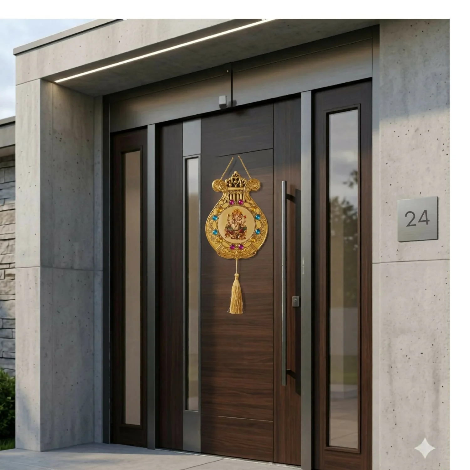 Invite prosperity and positive energy into your home with this exquisite Gold-Plated Lord Ganesha Wall Hanging. Designed with a unique harp-inspired silhouette, this decorative piece features a beautifully detailed image of Ganpati Bappa surrounded by vibrant blue and purple gemstones.