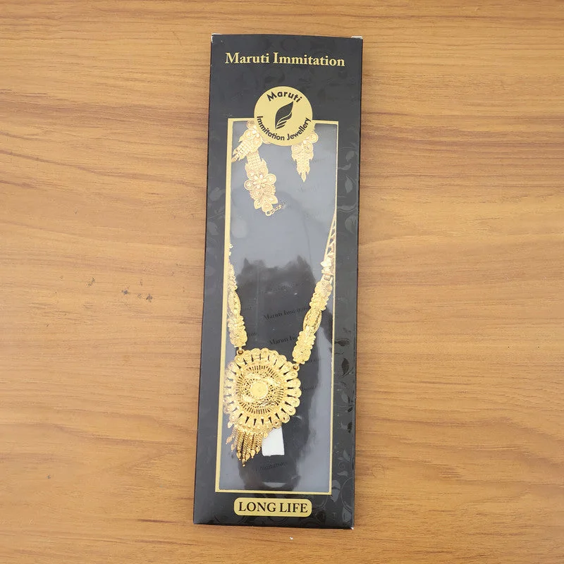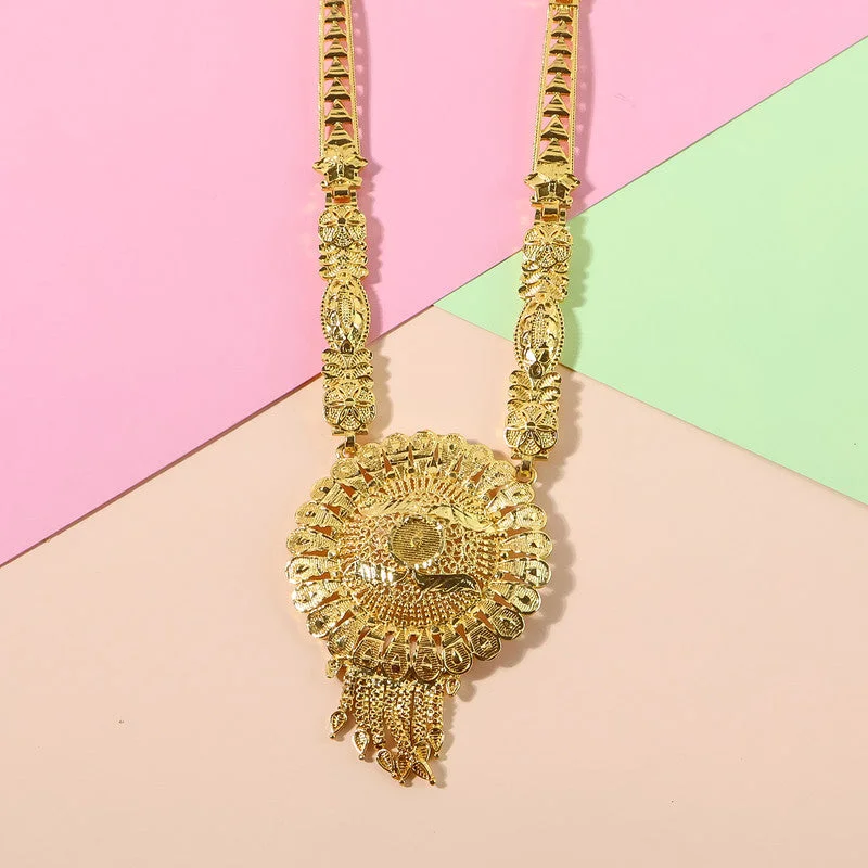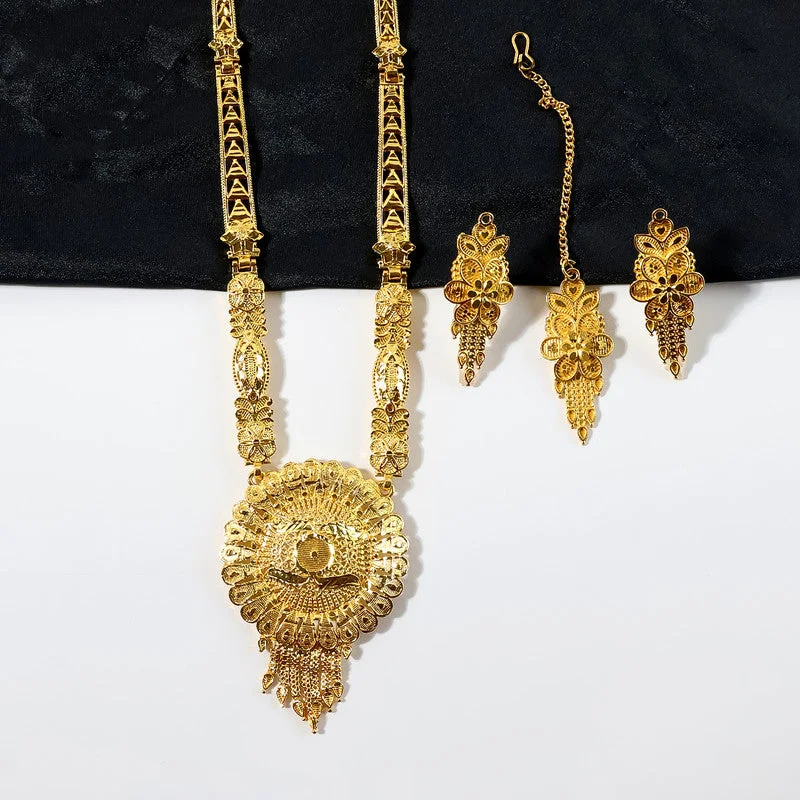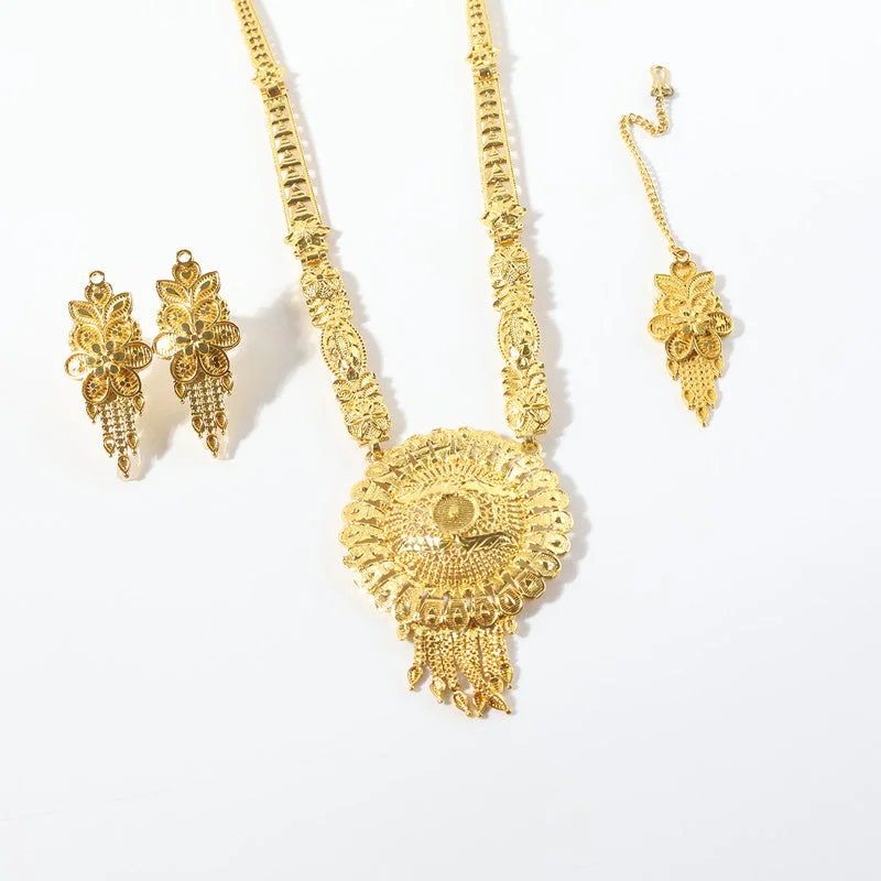 This exquisite necklace set features a stunning round mandala-style pendant crafted with intricate detailing and a radiant layered design that instantly elevates any traditional outfit. The long artistic chain showcases beautifully carved motifs, adding elegance and a rich heritage feel to the overall look. Paired with matching floral drop earrings and a complementary maang tikka, the set offers a complete festive ensemble perfect for weddings, cultural functions, and celebration wear. Its trending mandala pattern, shimmering finish, and detailed craftsmanship make it a standout choice for women seeking a modern yet culturally inspired jewellery style.