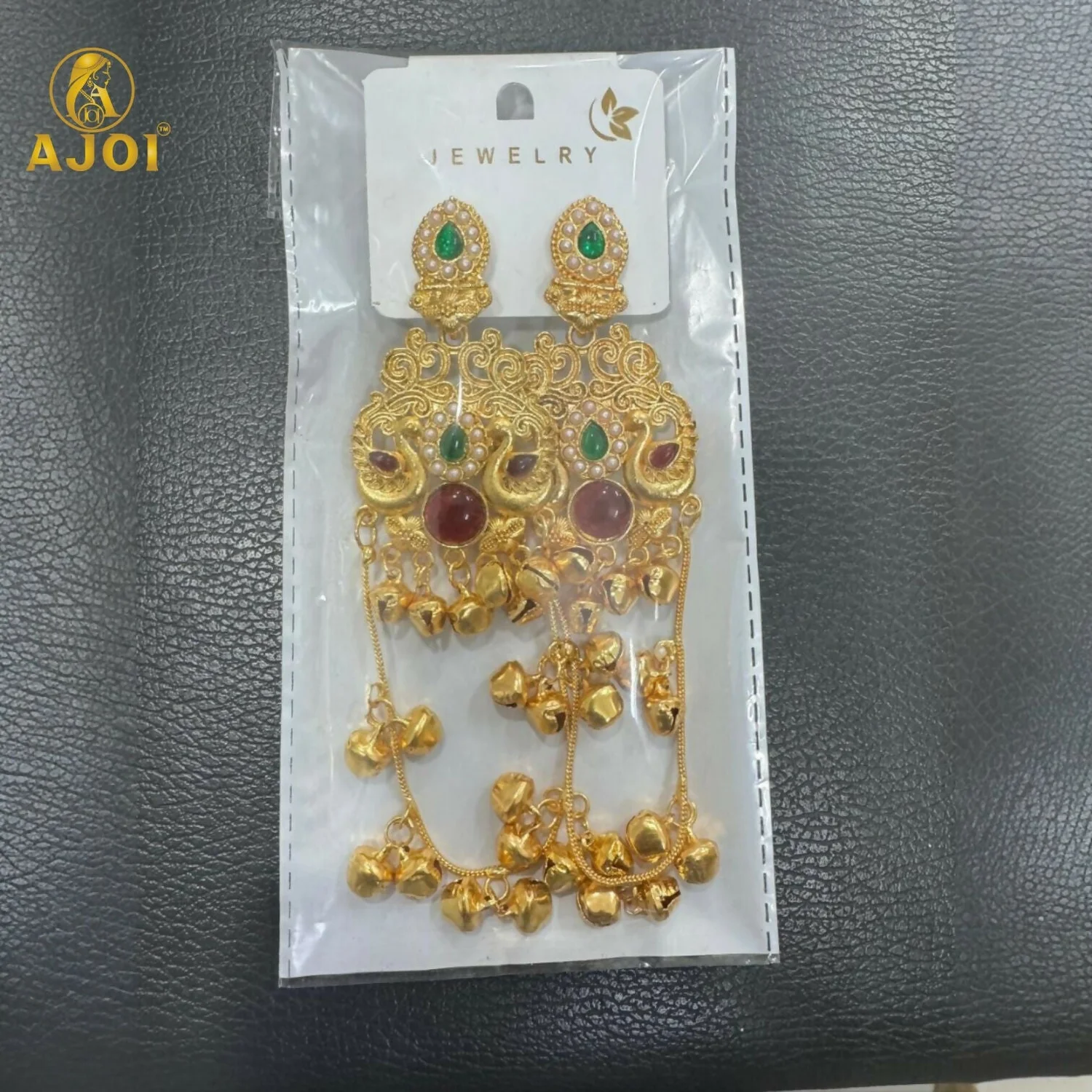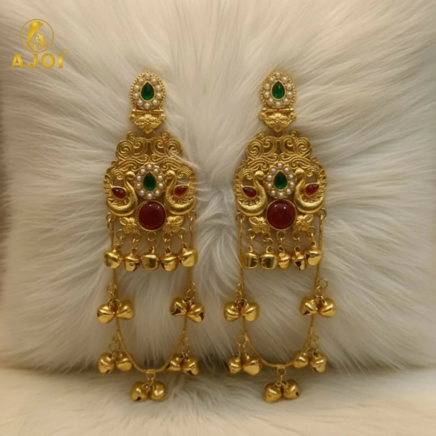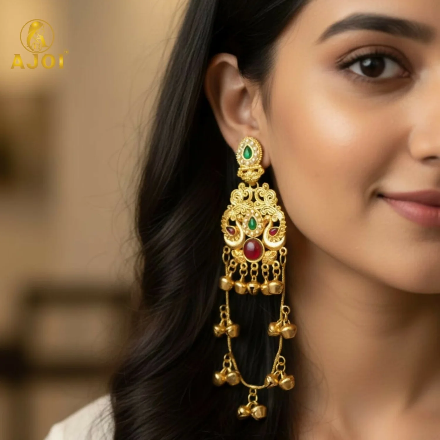 Delicate ghungroo drops hang gracefully from the base, producing a soft, traditional movement that adds charm and elegance with every step. Despite their bold appearance, the earrings are designed to be comfortable for extended wear, making them ideal for long wedding functions and festive occasions.