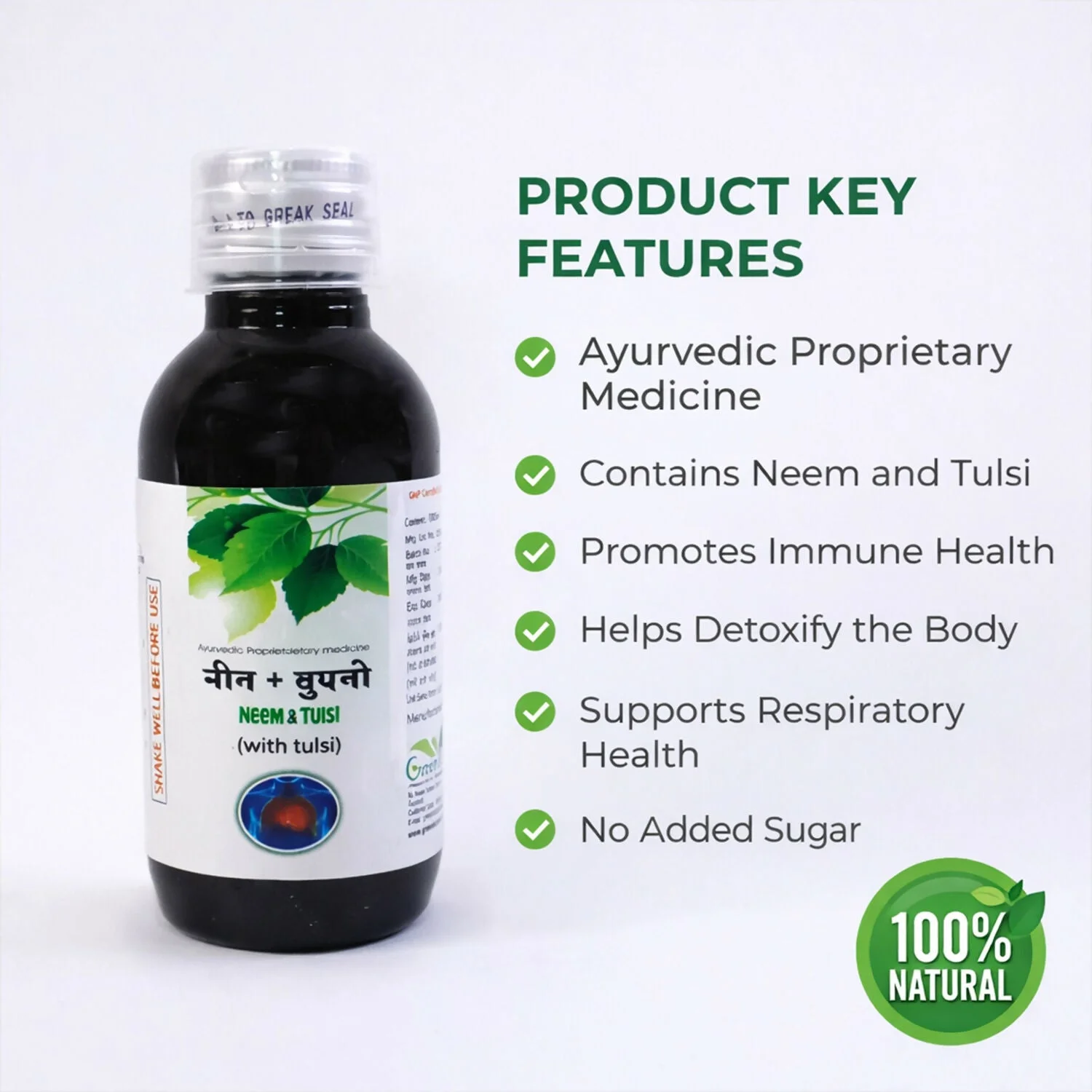 Grilip Kaf Syrup 100ml is an Ayurvedic proprietary formulation enriched with Neem and Tulsi to support respiratory wellness. Designed to help maintain healthy liver function and aid natural detoxification, this herbal syrup promotes better digestion and overall immunity. The natural blend of traditional ingredients helps soothe throat discomfort and supports respiratory health. Free from added sugar, it is suitable for regular use as advised. A herbal solution crafted to strengthen internal wellness and support immune balance.