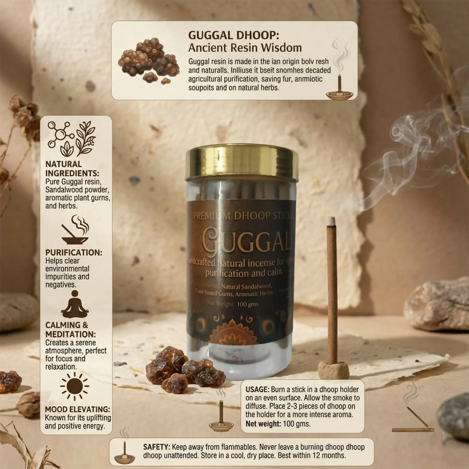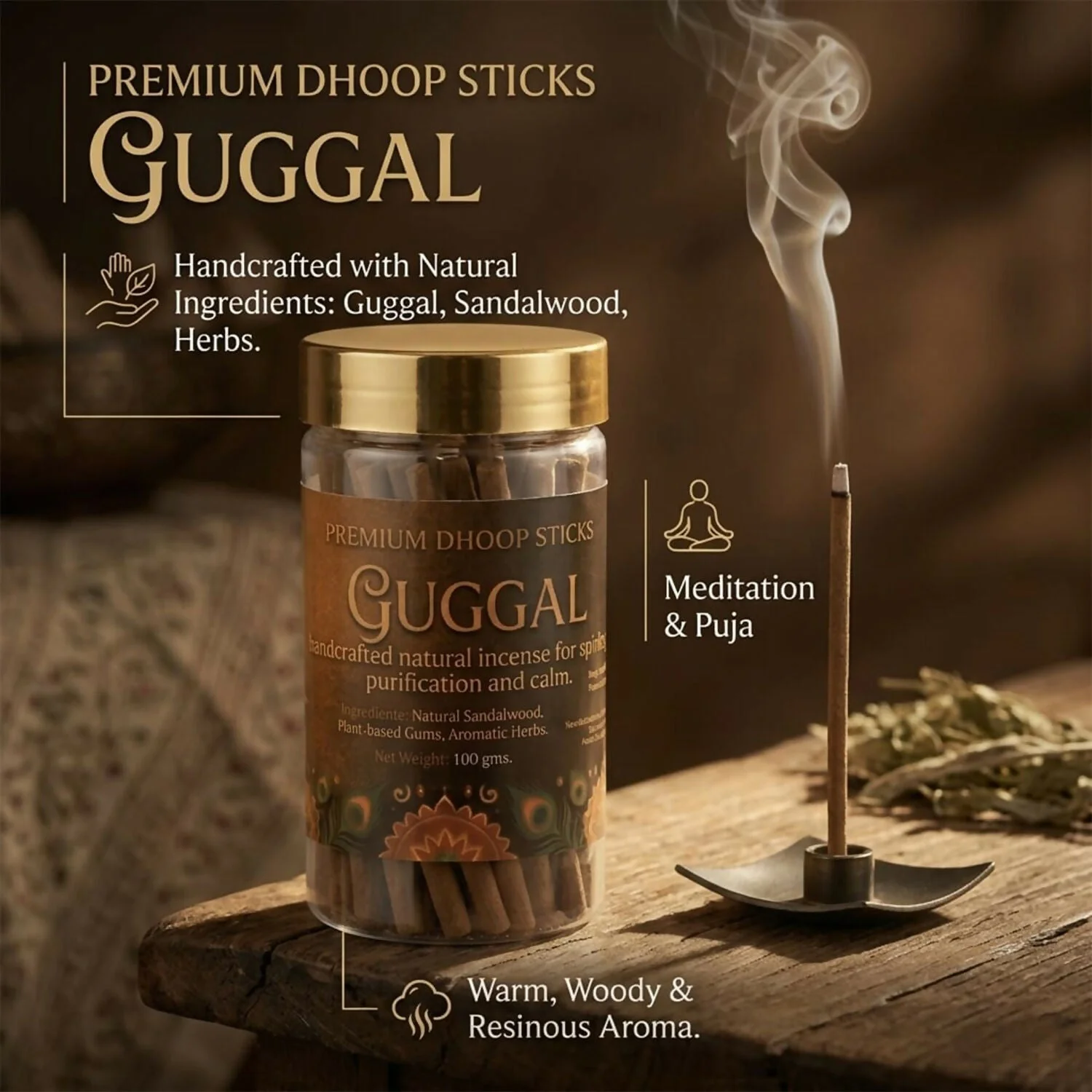 Experience the traditional essence of purity and calm with these premium Guggal dhoop sticks, crafted to elevate your spiritual and everyday environment. Infused with the rich aroma of natural guggal resin, sandalwood, and aromatic herbs, these dhoop sticks create a warm, woody, and soothing fragrance that helps purify the surroundings. Ideal for daily pooja, meditation, and relaxation rituals, they promote a peaceful atmosphere while reducing stress and enhancing focus. Carefully handcrafted using natural ingredients, these incense sticks offer a long-lasting fragrance that transforms any space into a serene and uplifting environment. Perfect for homes, temples, yoga sessions, or simply unwinding after a long day.