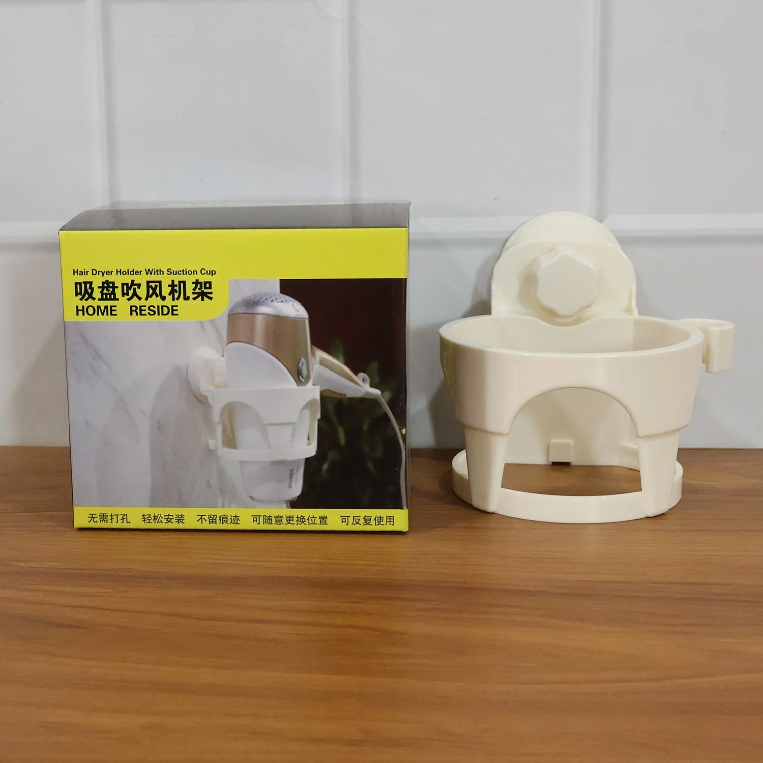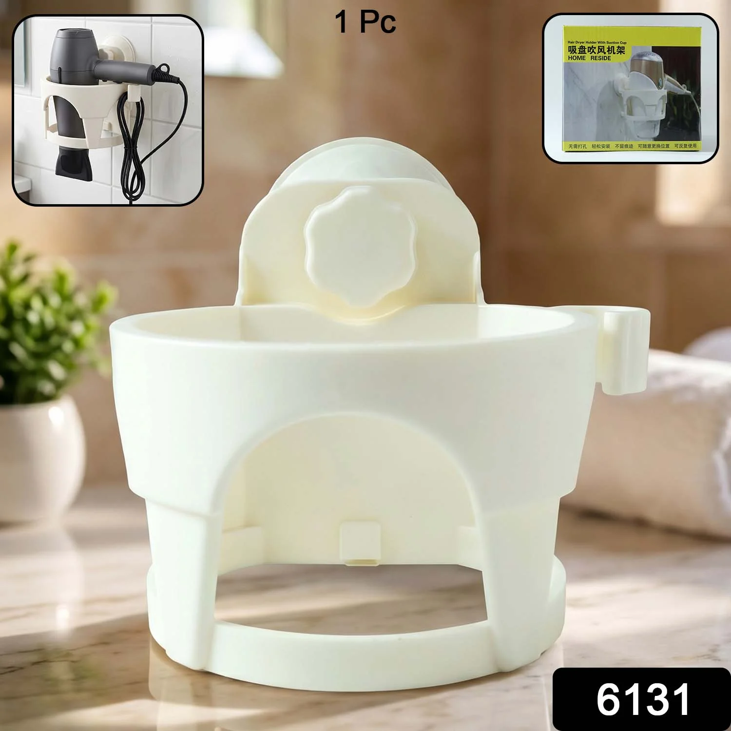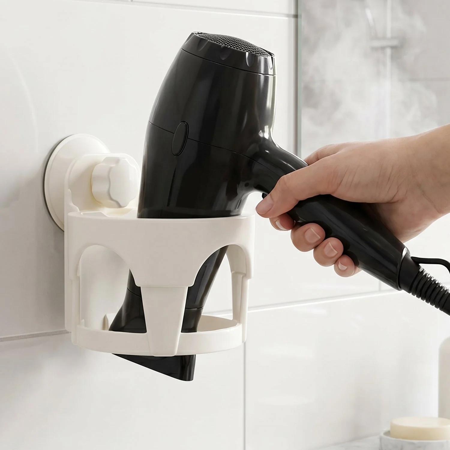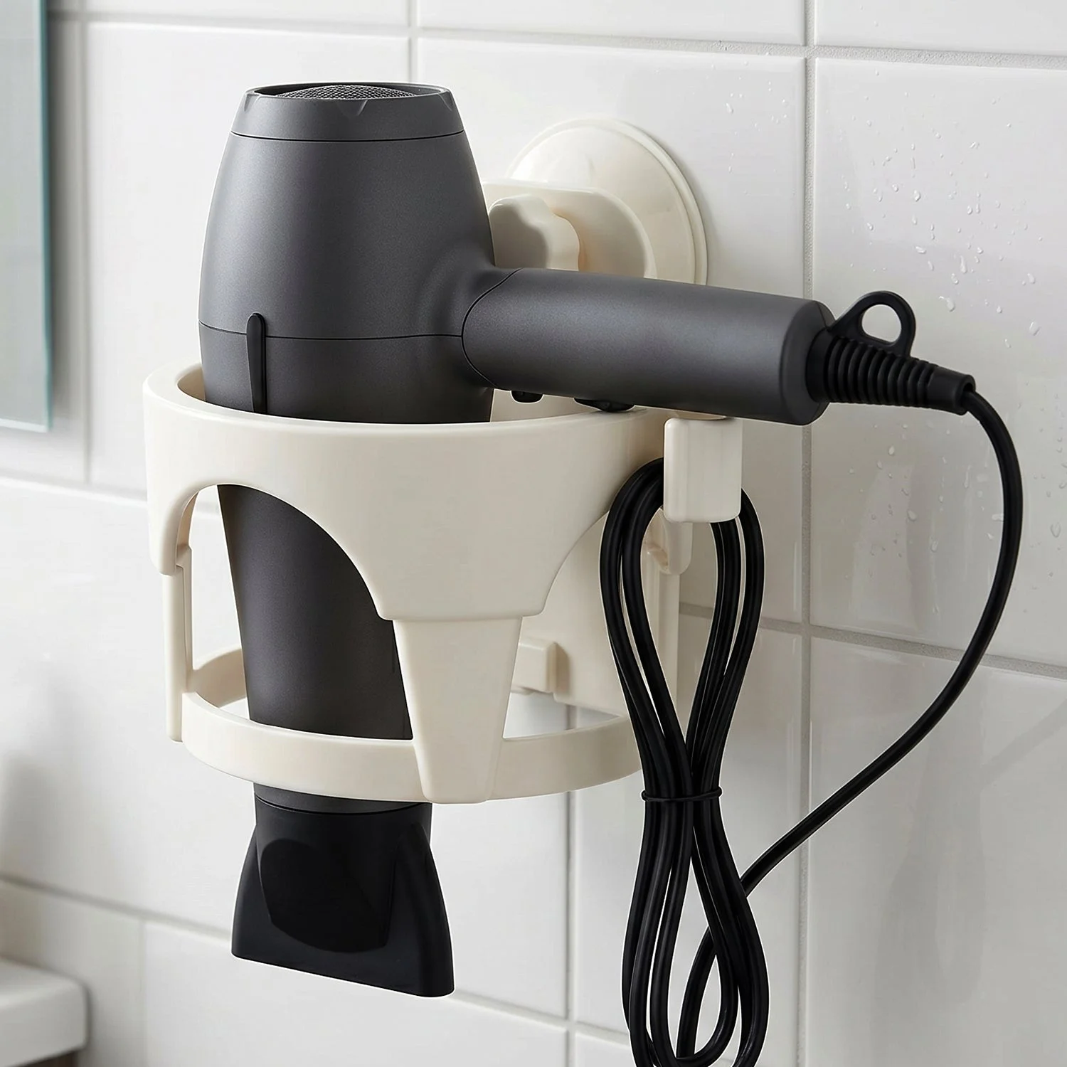 Organize your bathroom space with this easy-to-install hair dryer holder featuring a suction cup design. This compact and durable holder allows you to conveniently store your hair dryer and keep it within easy reach whenever you need it. The suction cup ensures that the holder stays firmly in place without the need for drilling or screws. Perfect for small spaces or areas where you want to keep your hair tools organized and clutter-free, it’s ideal for both home and salon use. It is designed to fit most standard-sized hair dryers securely.