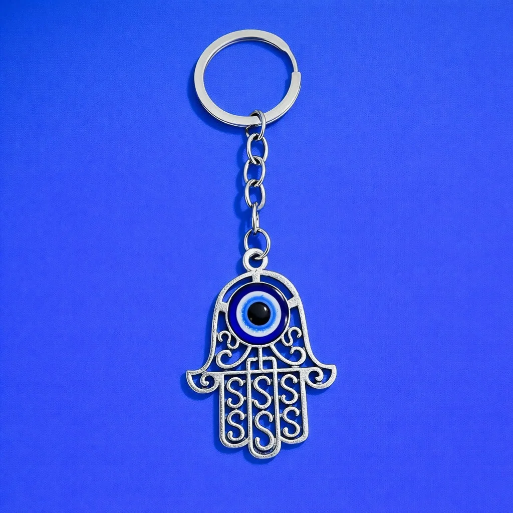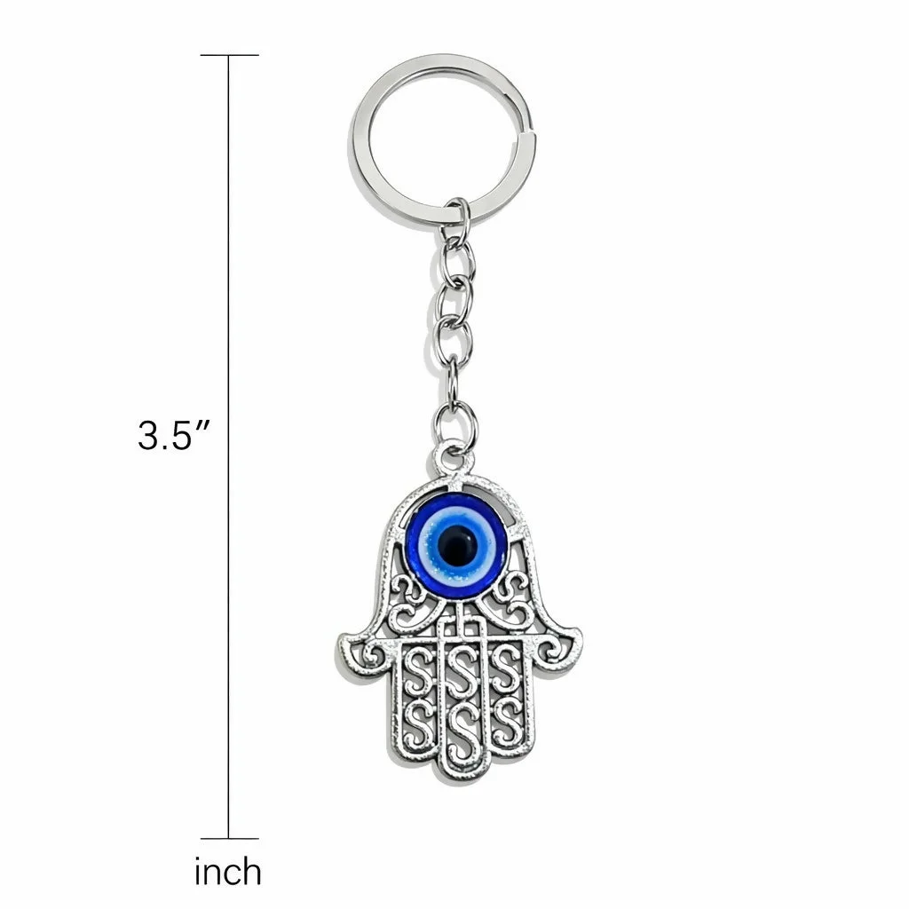 Add a symbol of protection and positivity to your everyday essentials with this Hamsa evil eye keychain. Designed in the classic Hamsa hand shape and highlighted with a striking blue evil eye, this keychain is believed to guard against negativity while adding a stylish decorative touch.