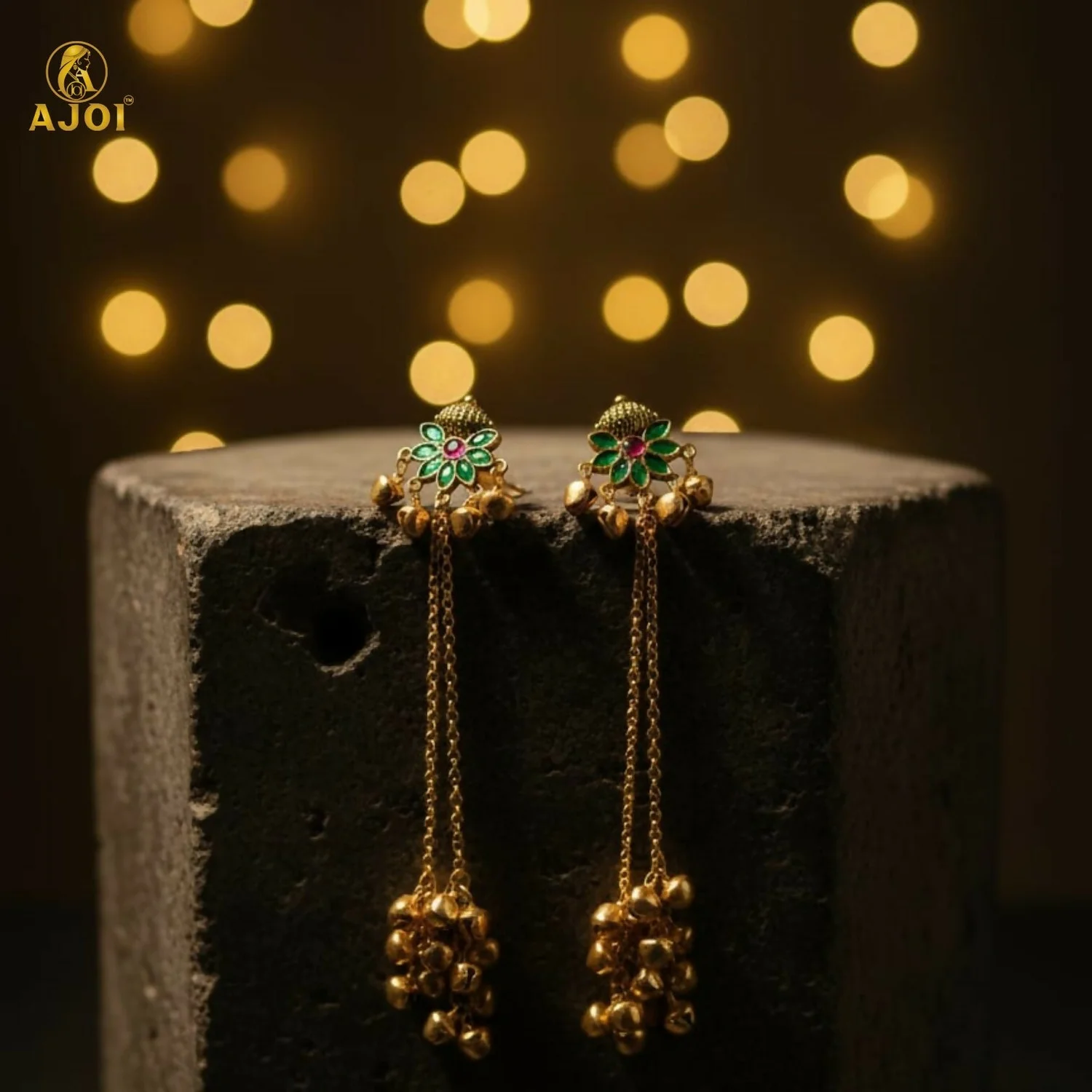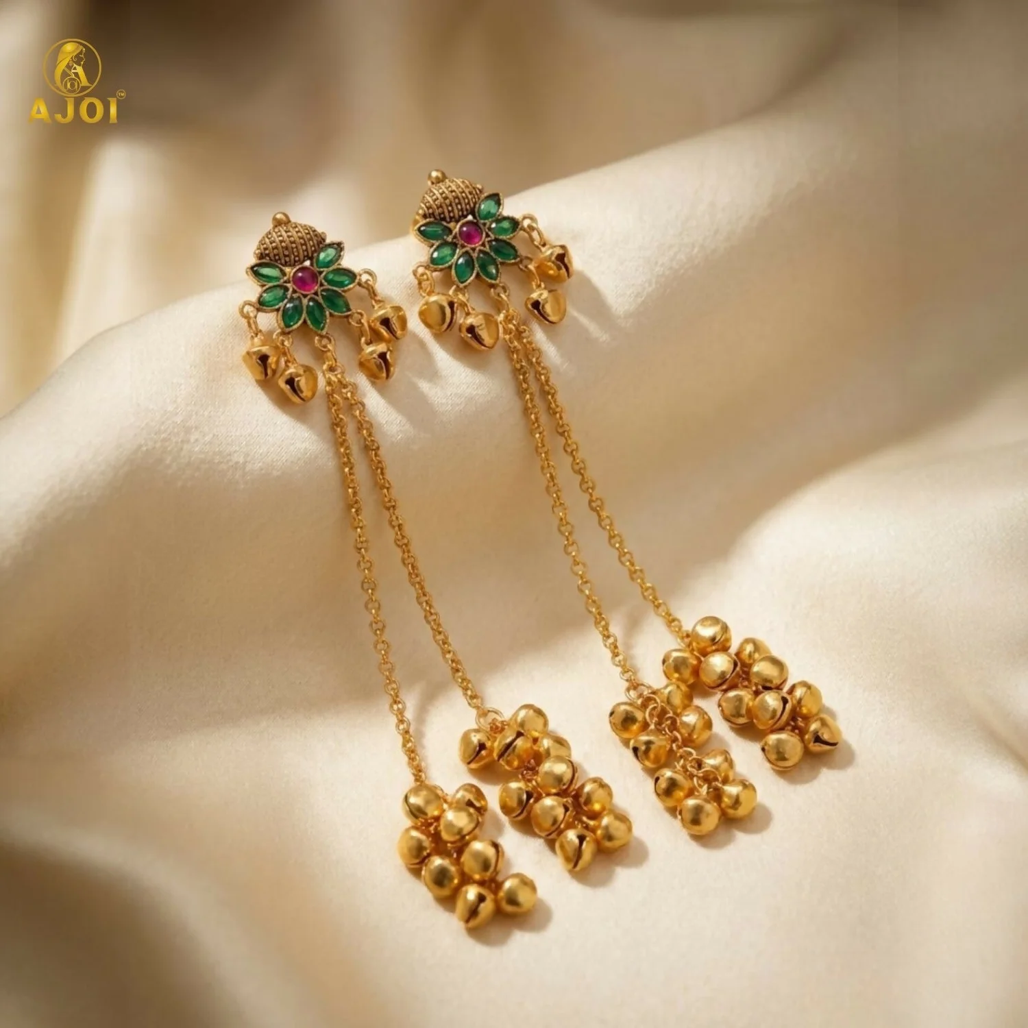 From the stud, delicate dual gold-tone chains cascade gracefully, ending in clusters of finely polished ghungroo bell drops that create a soft, rhythmic movement with every step. The antique gold finish enhances the traditional appeal, making these earrings a perfect blend of vintage artistry and contemporary sophistication.