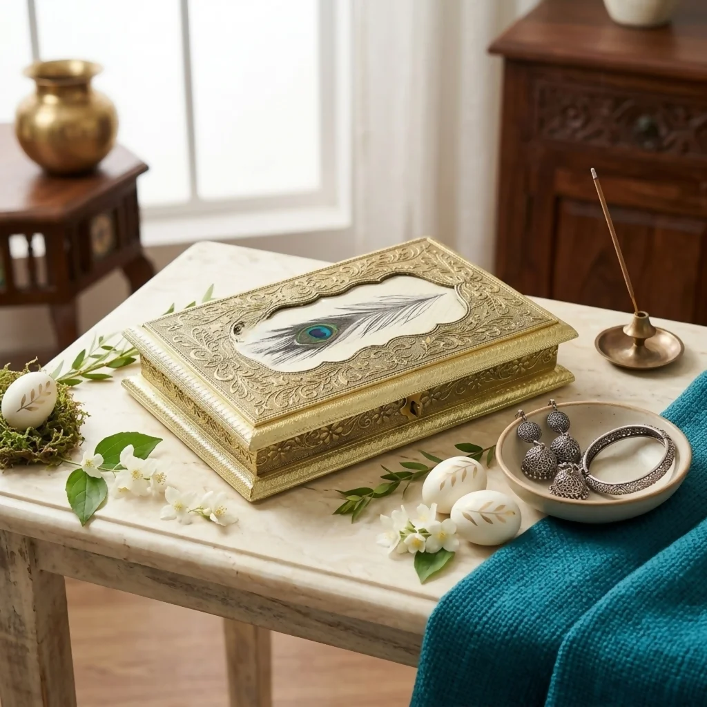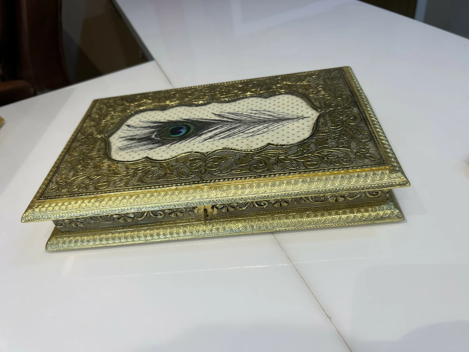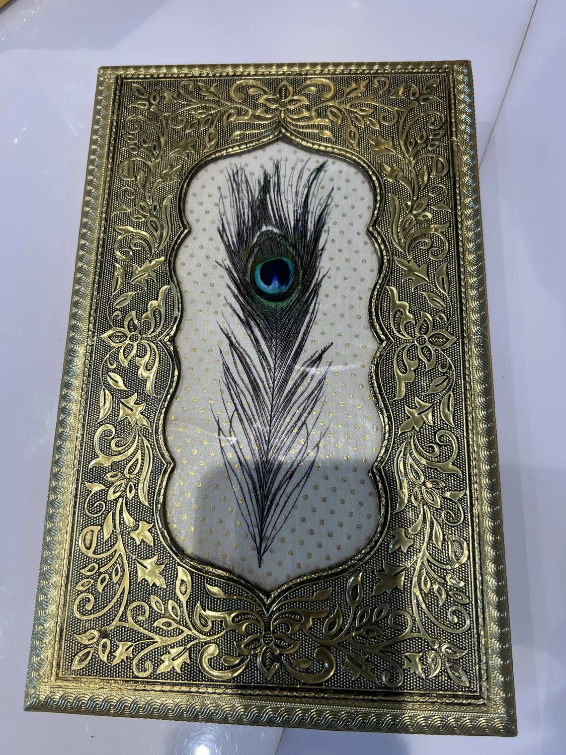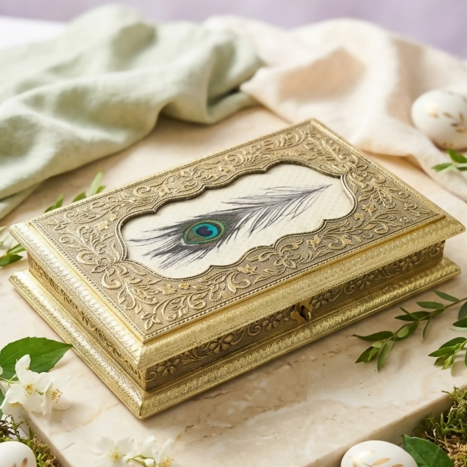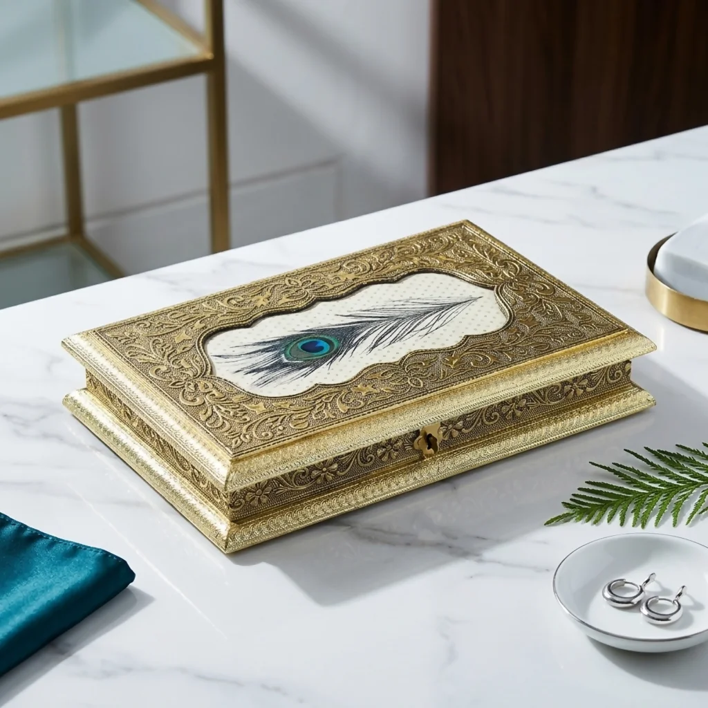 Elevate your vanity with a touch of timeless elegance and cultural artistry. This stunning handcrafted box features intricate golden embossing and a striking peacock feather motif, blending traditional craftsmanship with functional luxury. Whether you're securing your precious jewelry or seeking a statement piece for your coffee table, this decorative box offers a sophisticated storage solution that doubles as a work of art.