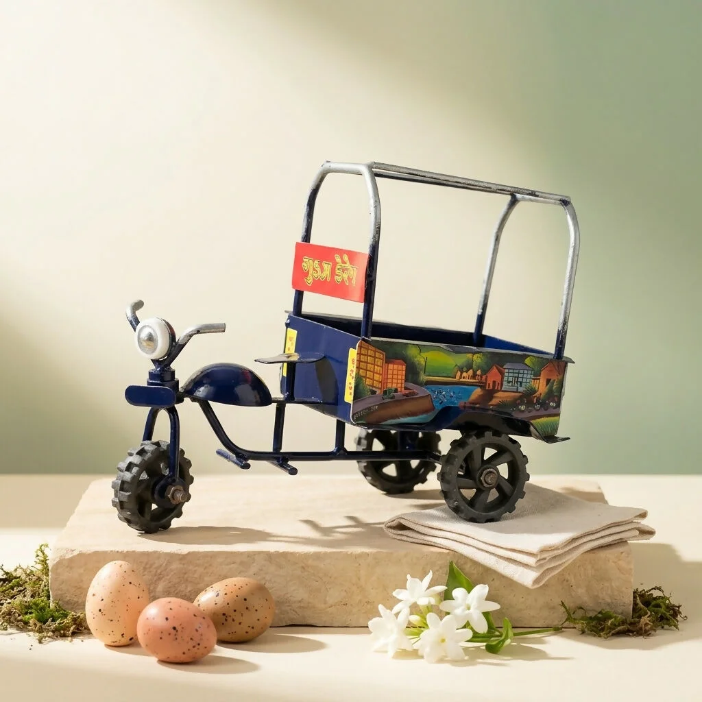 • Exquisite Detailing: Features a realistic handlebar design, a decorative headlight, and a canopy frame that mimics the real-life utility vehicles found across rural India.