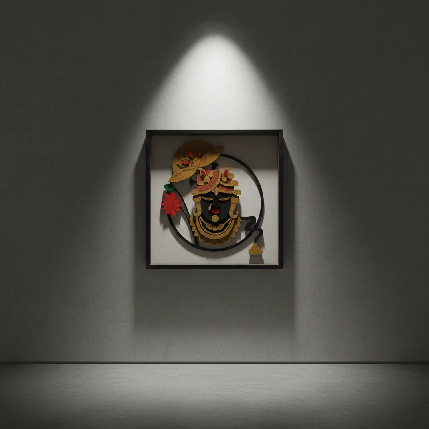 This sacred wall frame features Shreenathji (Lord Krishna) in a beautifully layered 3D design, symbolizing devotion, protection, and prosperity. Each layer is precision from premium quality wood and hand-assembled by skilled Indian artisans to create stunning depth, elegance, and detailing.