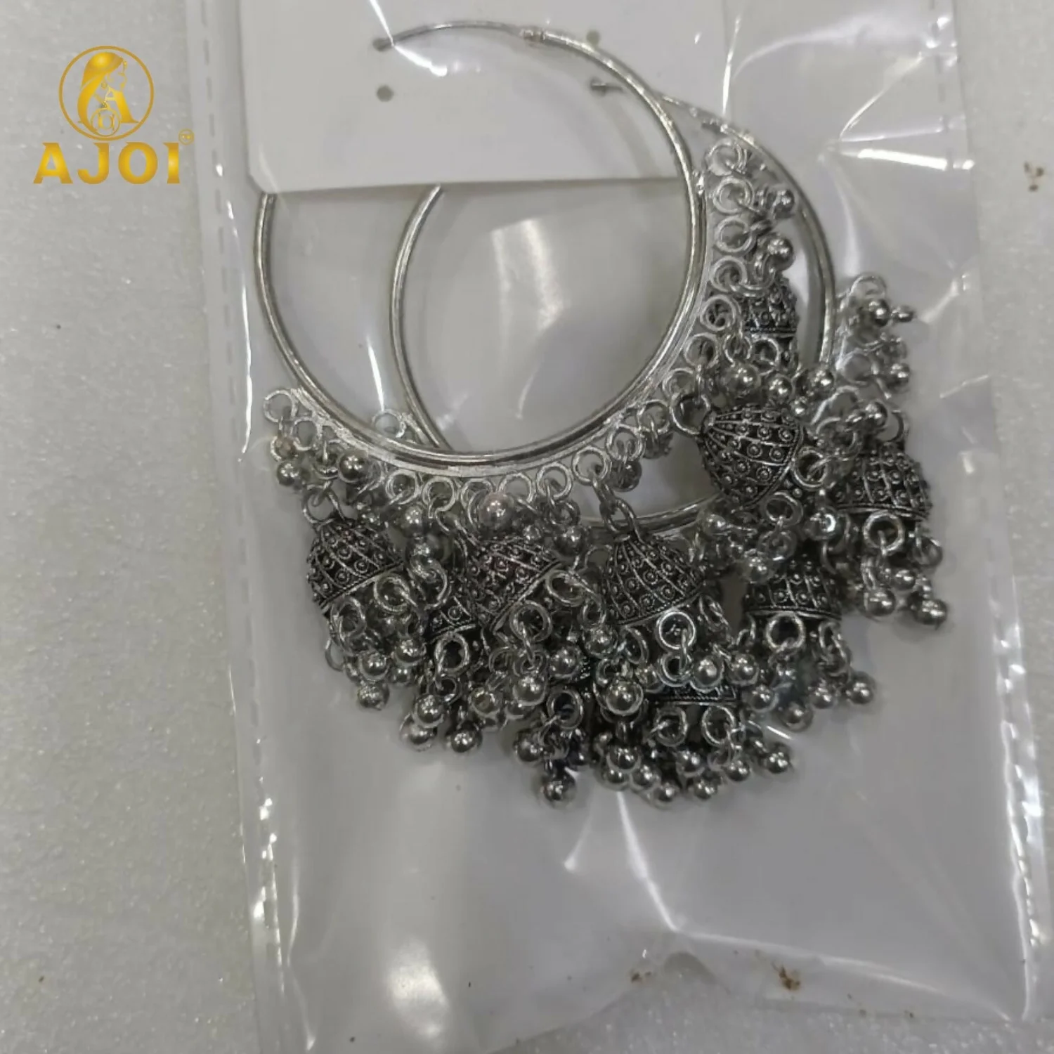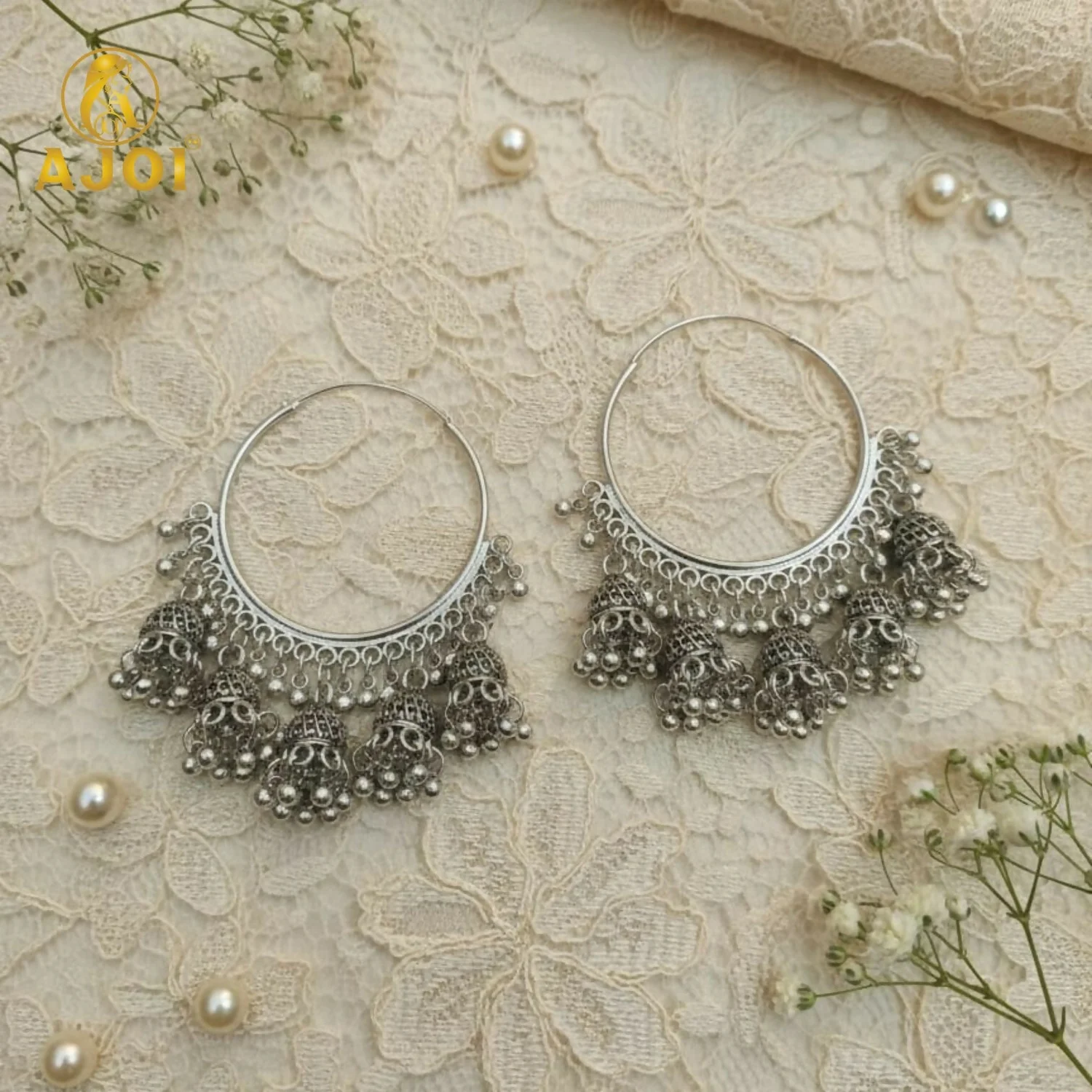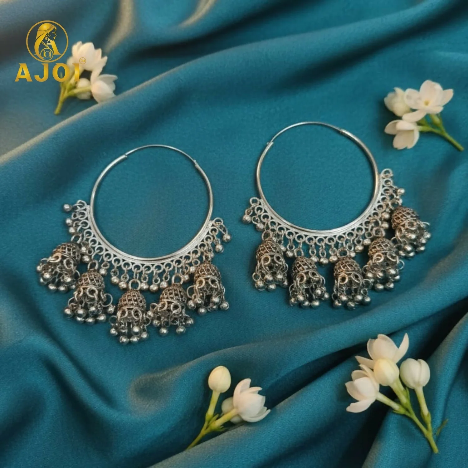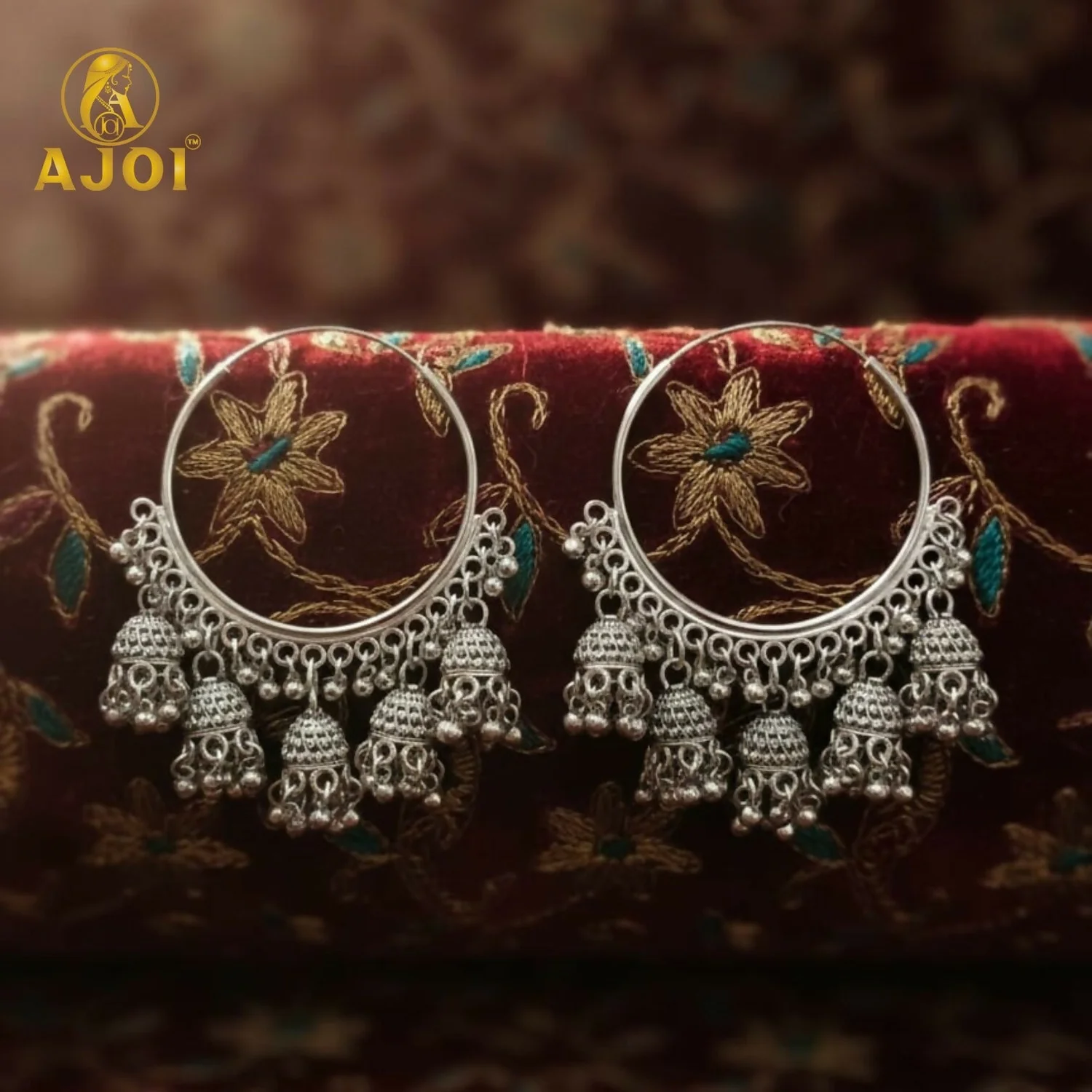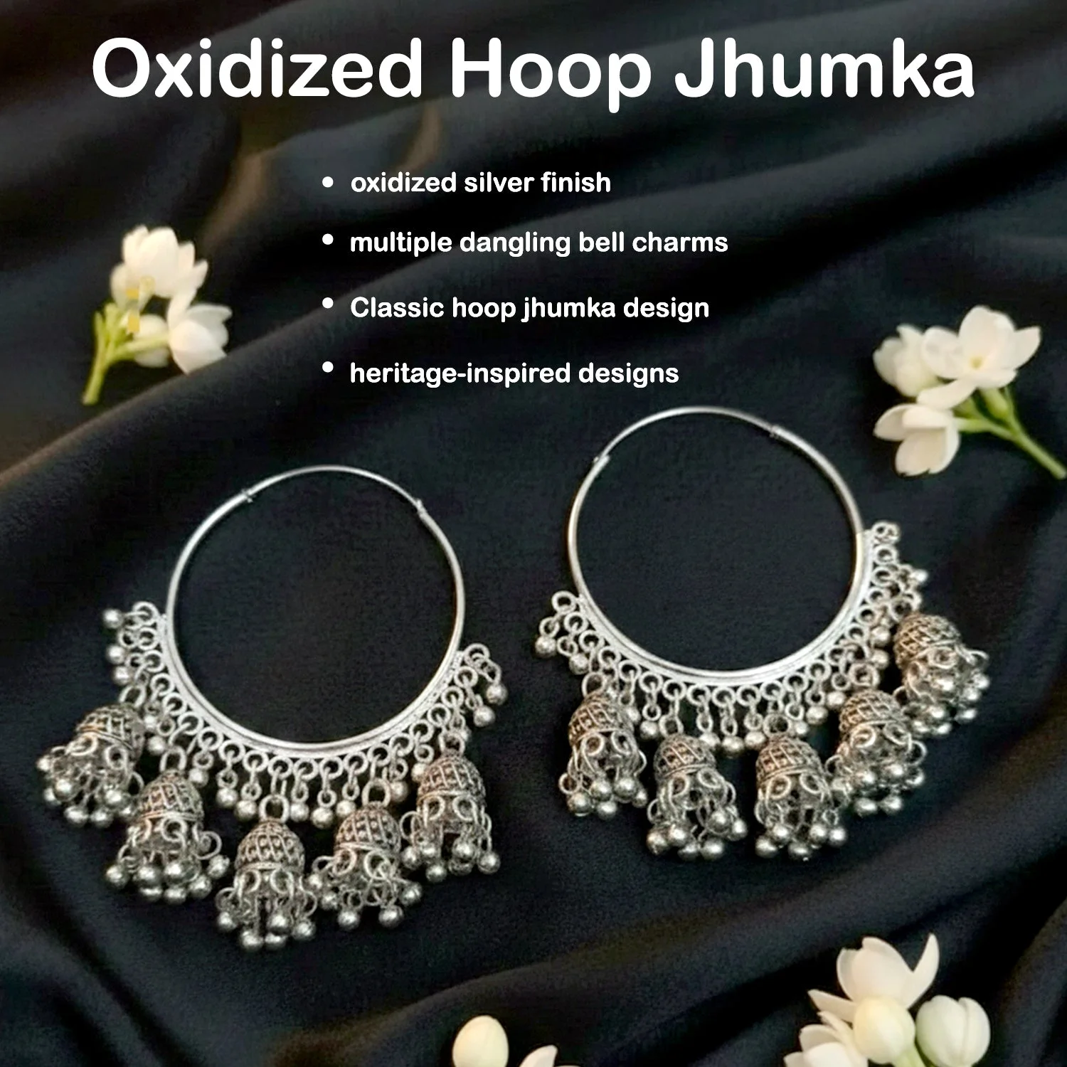 Suspended gracefully from the hoop are multiple finely detailed jhumka bell danglers, each embellished with tiny silver bead accents. The layered movement of the danglers creates a soft rhythmic sway, enhancing the earrings’ traditional appeal and making them a striking accessory for festive and cultural occasions.