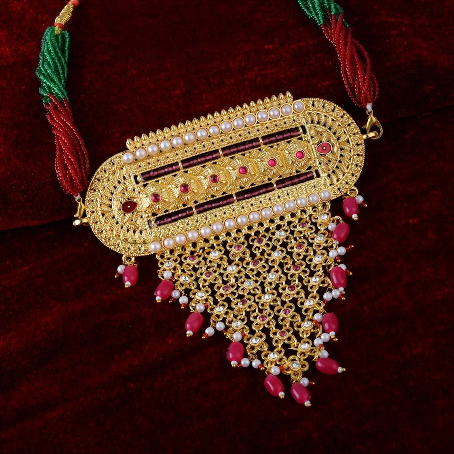 The Aad is embellished with a graceful combination of pearls, ruby stones, and intricate carving work, balancing tradition with striking visual appeal. The top row of pearls adds sophistication, while the embedded ruby stones enhance the classic ethnic charm—making this piece truly unique. The lower portion features an elaborate golden mesh lattice, finished with teardrop ruby beads that add movement, color, and royal elegance to your bridal or festive attire.