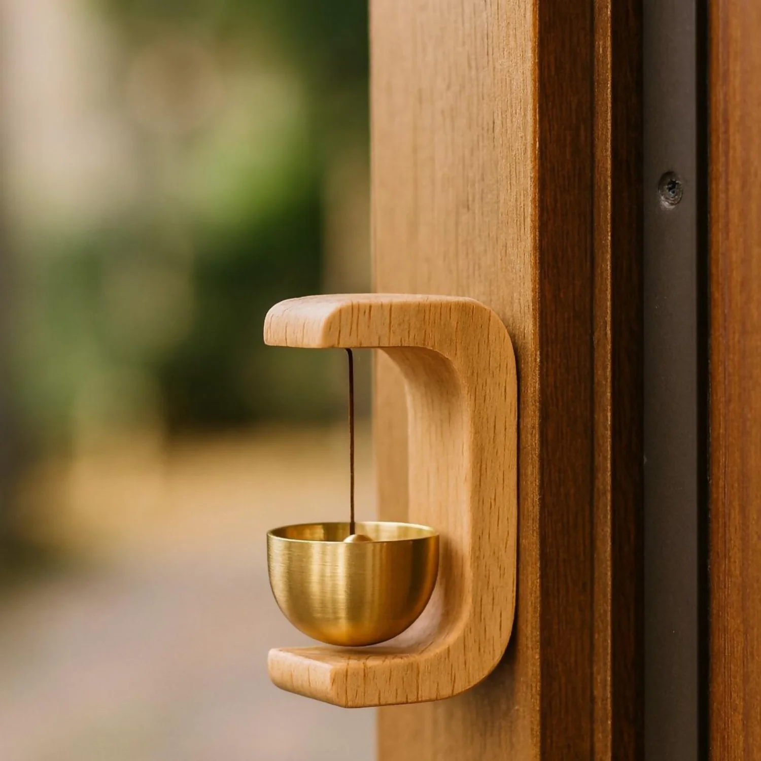 wooden door bell, brass doorbell hanging, handcrafted door chime, home entrance doorbell, pooja room bell, café entrance bell, shop door chime, rustic wooden doorbell décor, hanging brass bell for home, spiritual home décor bell, minimalist door bell, boutique entrance chime, natural wood doorbell design, decorative door hanging bell, indoor entrance bell décor, handcrafted wooden décor piece