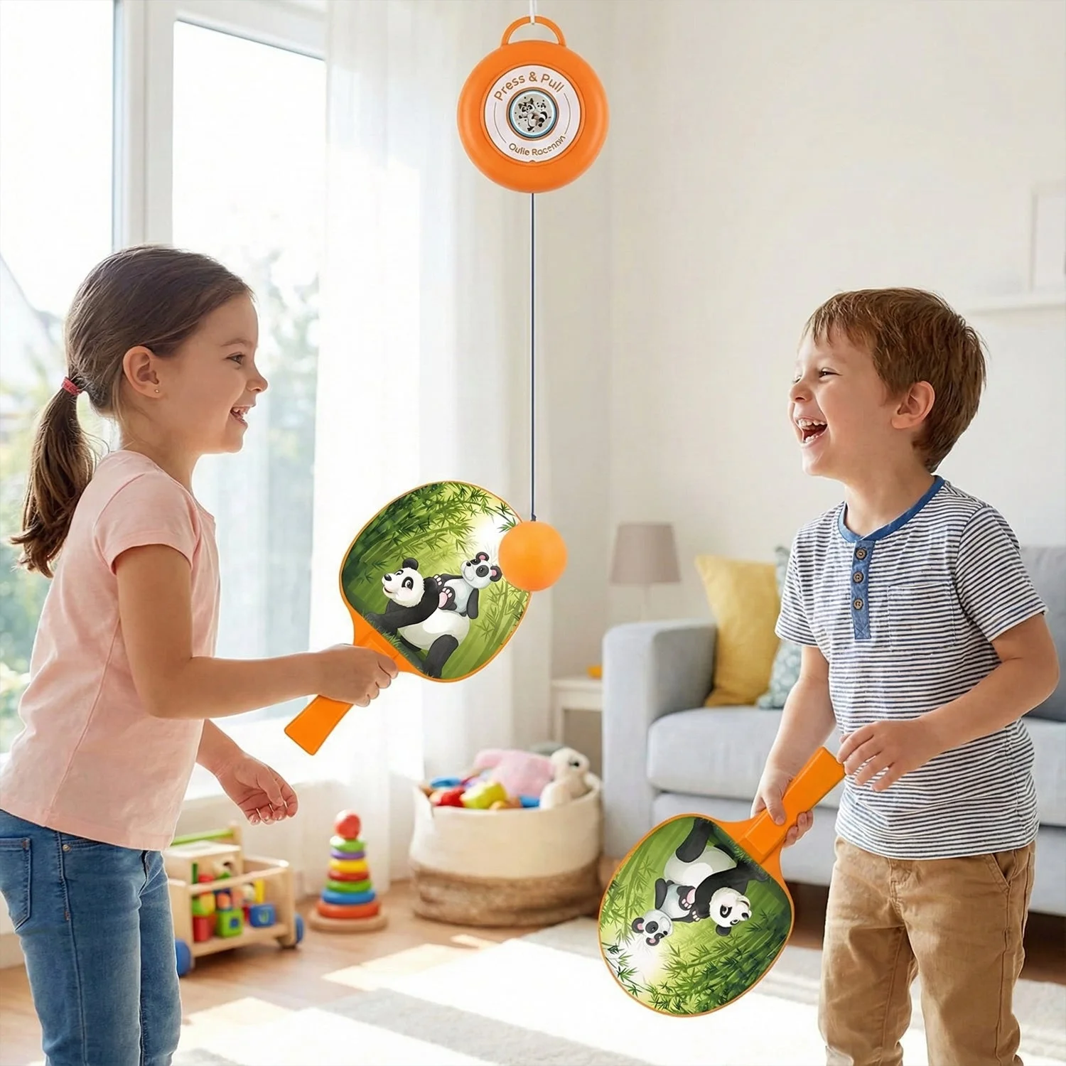 Hanging Table Tennis Trainer Set for Kids | Press & Pull Indoor Ping Pong Trainer with 2 Paddles & 3 Balls | Fun & Engaging Activity for Kids & Beginners | Panda Design (1 Set)