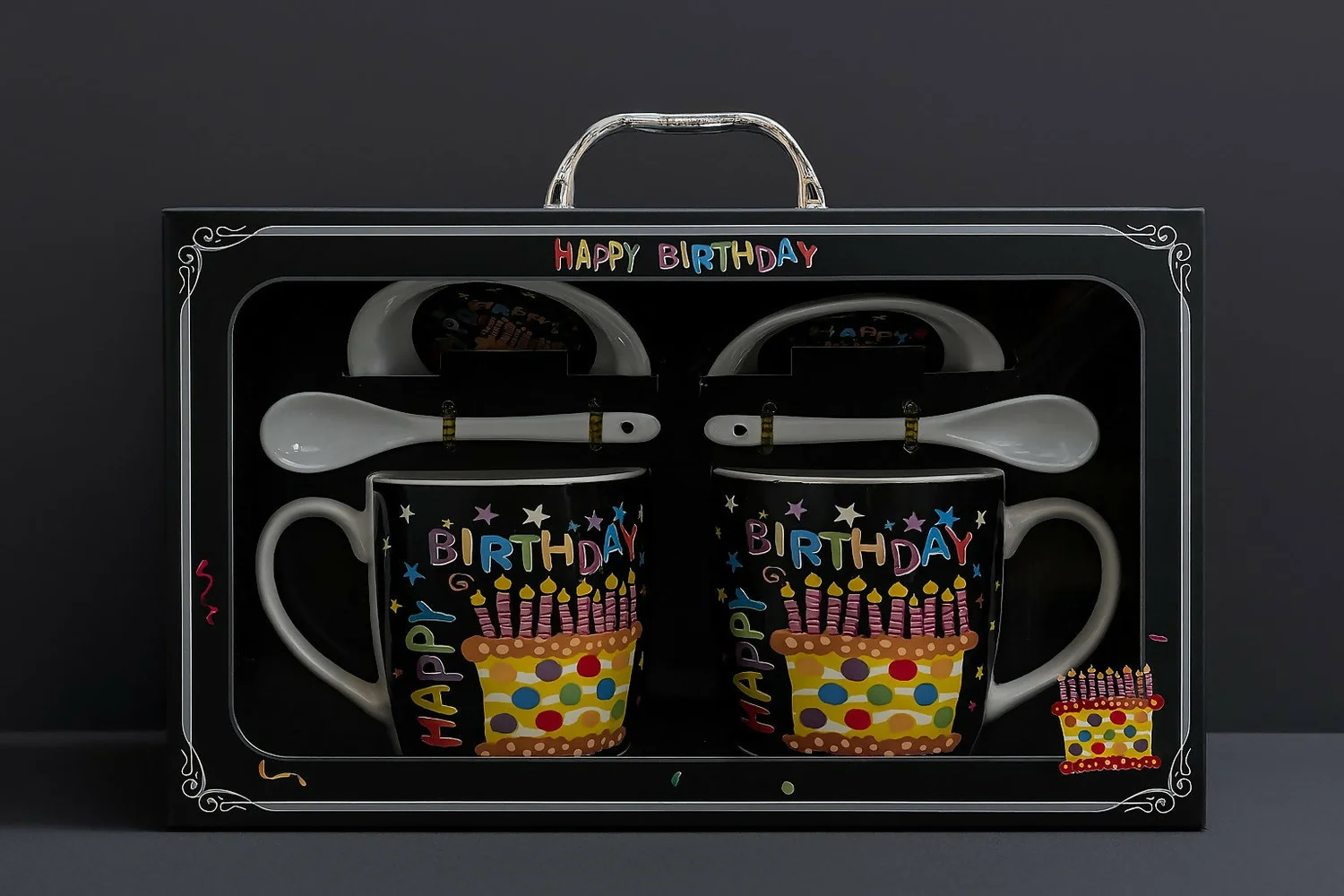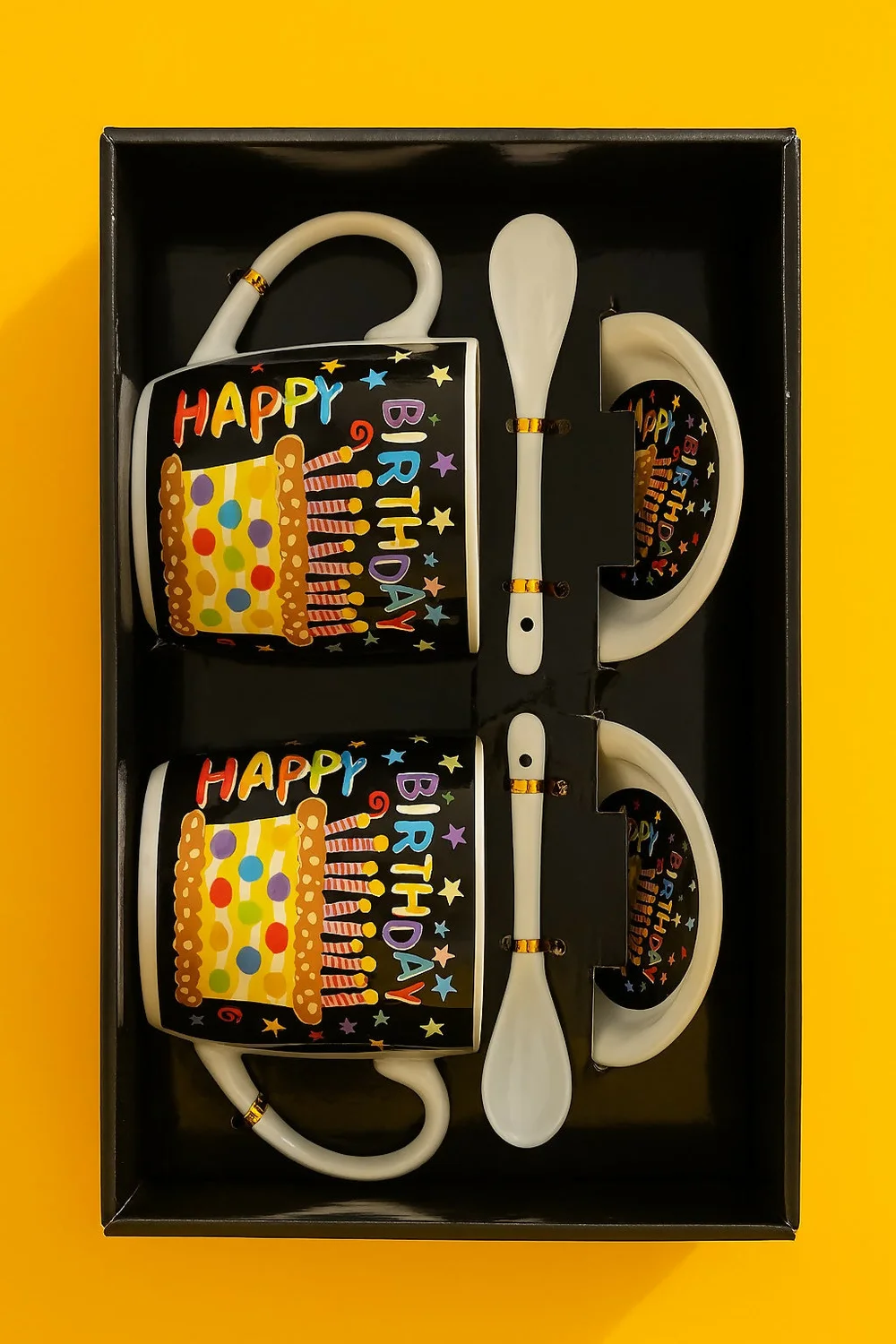 Celebrate birthdays in style with this vibrant and joyful ceramic mug set, featuring two beautifully printed “Happy Birthday” mugs with a fun cake and candle design. Perfectly matched with ceramic spoons and packaged in an elegant black gift box, this set is ideal for gifting friends, family, or colleagues. Whether it's for morning coffee or evening tea, these mugs add festive flair and make every sip a celebration.