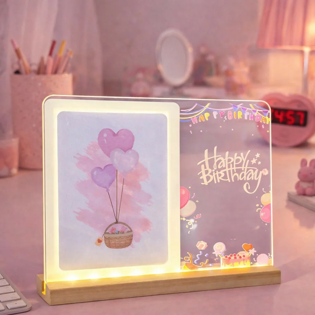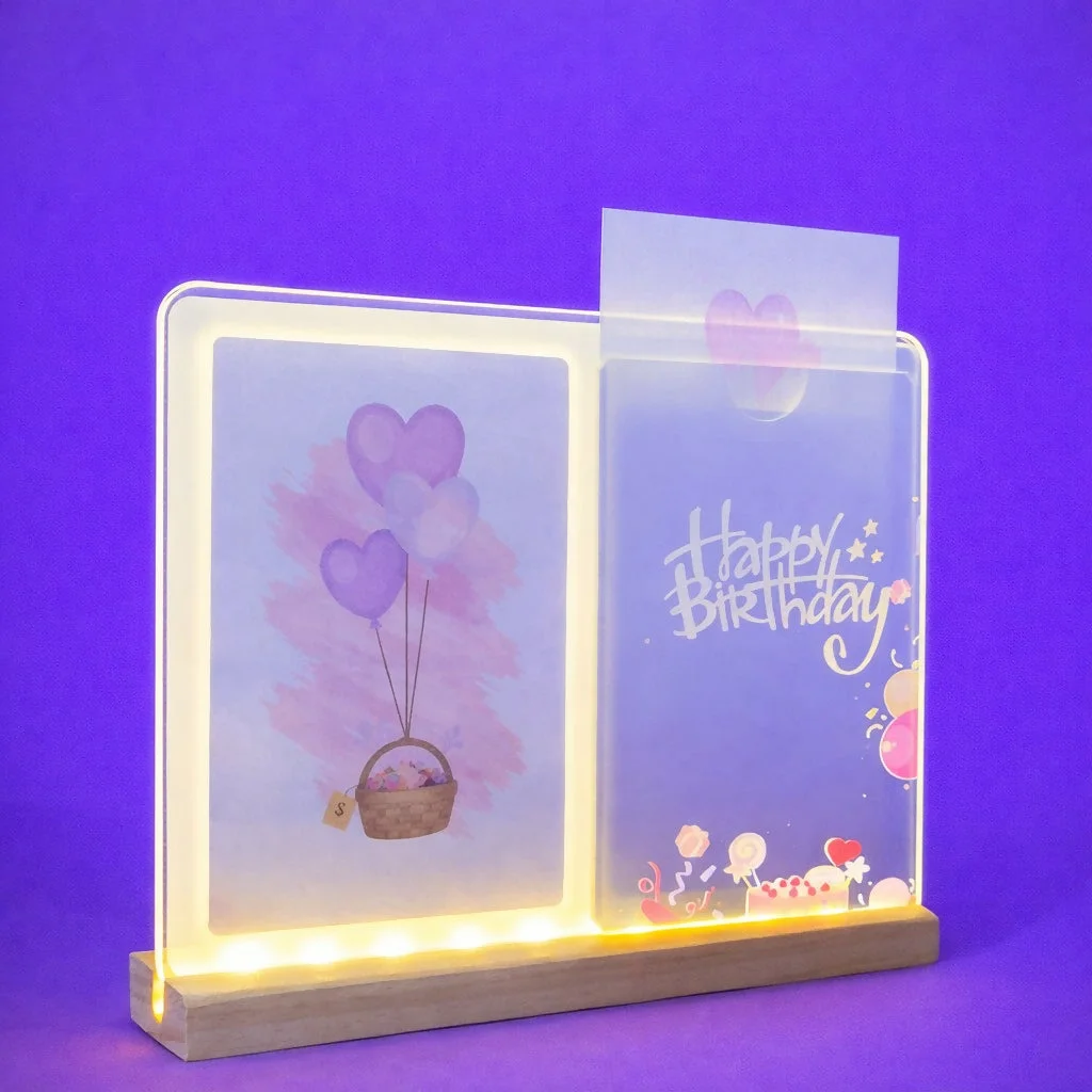 Enhance your décor with this stylish LED Acrylic Message Lamp featuring a beautifully printed panel and soft LED lighting. The clear acrylic design combined with a sturdy wooden base makes it a modern yet elegant decorative piece.