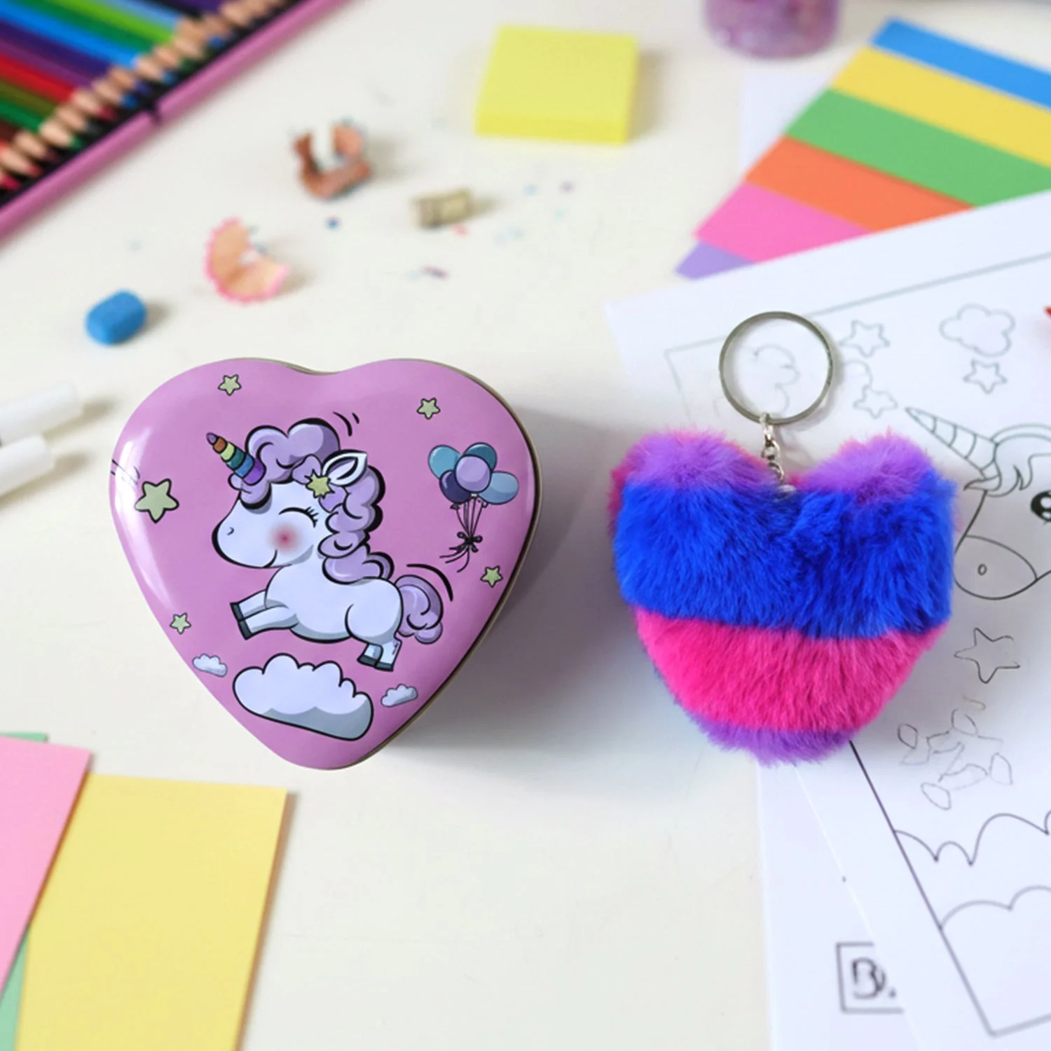 heart shape gift box set, cartoon gift box, plush keychain set, cute storage tin box, soft furry heart keychain, kids gift set, birthday gift combo, return gift set, party favor gift set, special occasion gifting, decorative heart box and keychain, novelty gift set for children, adorable gift box combo, playful heart keychain, multipurpose gift set, festive gifting set