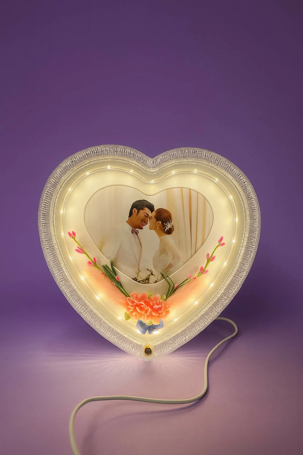 Designed with a heart-shaped body, delicate floral accents, and a central photo slot, this lamp is an ideal gift for couples, making it a thoughtful present for weddings, anniversaries, Valentine’s Day, or birthdays. It not only enhances your bedroom décor but also keeps your special moments glowing.