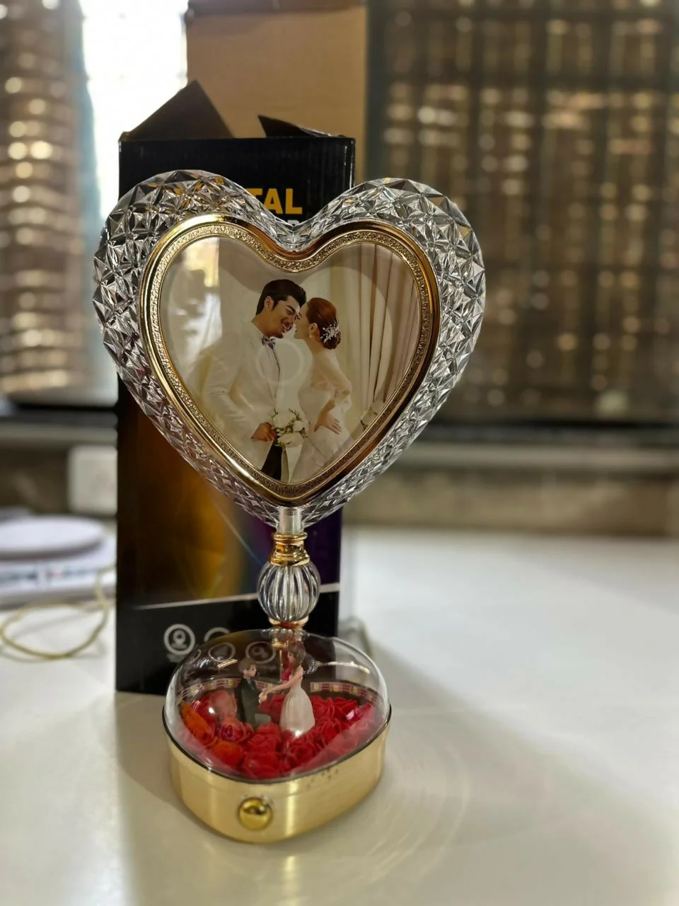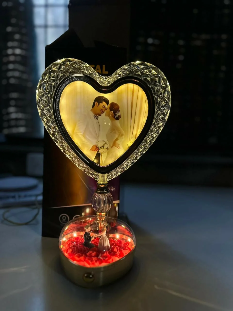 Bring elegance and romance to your space with this heart-shaped LED photo frame lamp. Designed with a crystal-style outer frame and a beautifully detailed base filled with artificial roses and a miniature couple figurine, it creates a stunning decorative piece. The soft LED glow enhances your displayed photo while adding warmth to your bedroom or desk setup. Perfect for gifting and home decor, this lamp combines beauty and functionality in one unique design.