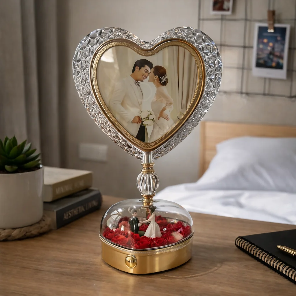 heart photo frame lamp, LED photo lamp, rose dome lamp, romantic table lamp, couple gift lamp, bedroom decor light, decorative night lamp, anniversary gift, wedding gift, LED heart frame, home decor lighting, photo display lamp
