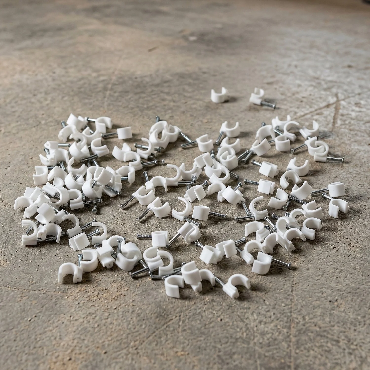 Loose wires running along walls can create clutter and safety concerns in homes or offices. The Heavy Duty Plastic Cable Clip with Steel Nail (100 Pc) helps secure cables neatly in place. This plastic cable clip with steel nail keeps wiring organized and stable.